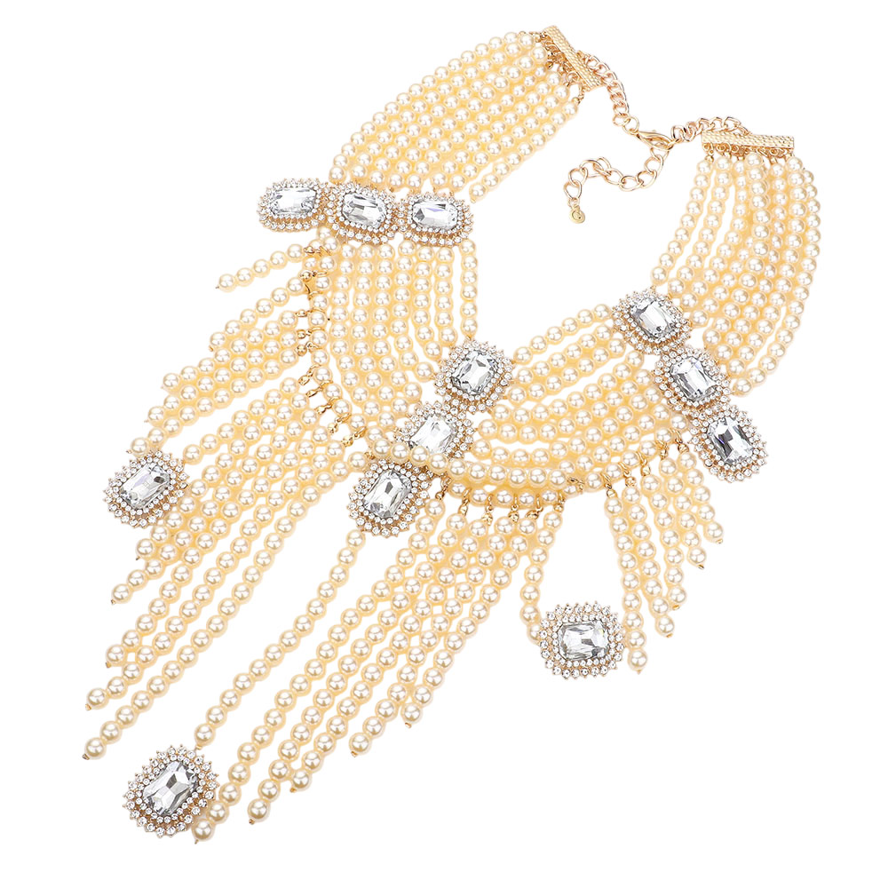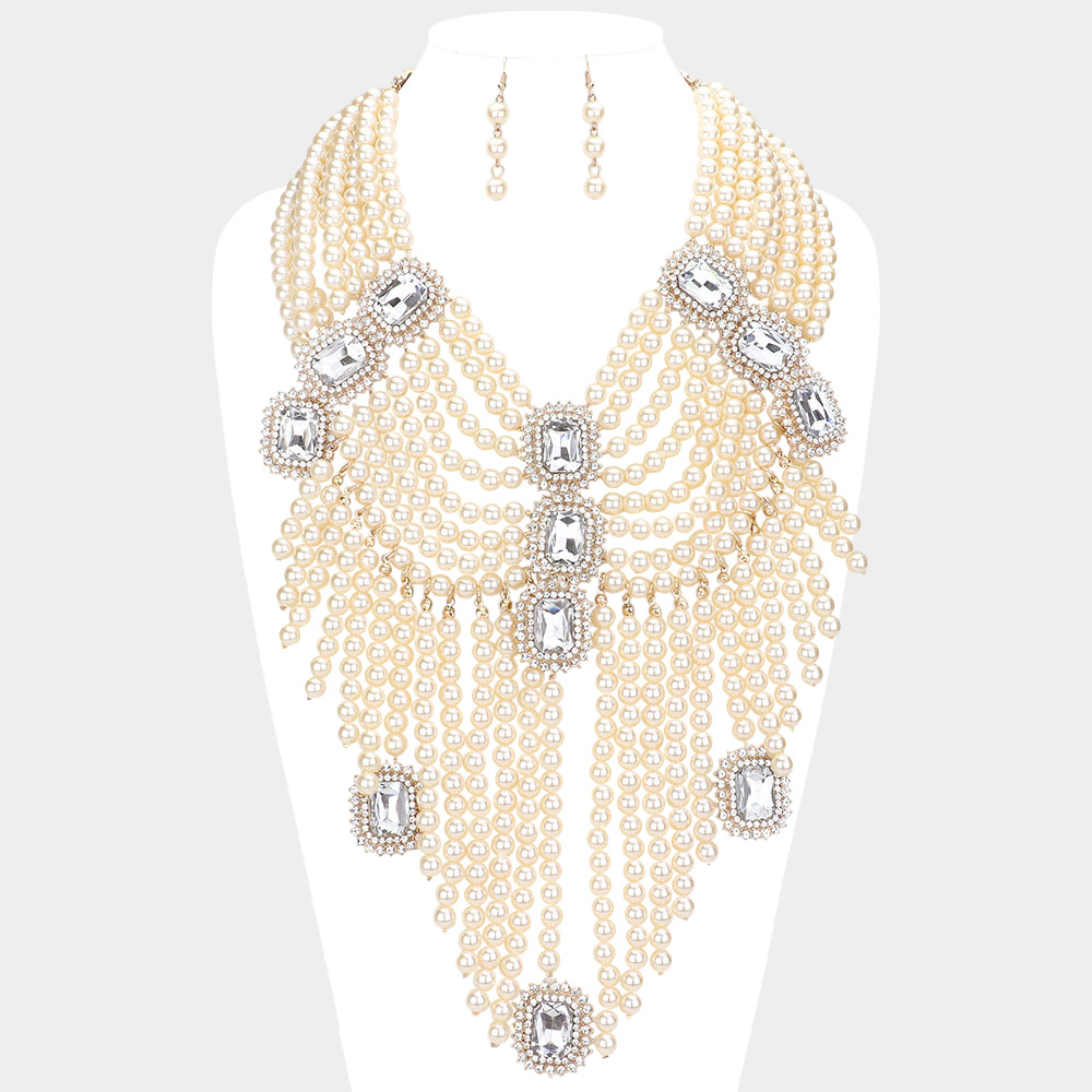 Rhinestone Paved Geometric Square Pendant Pearl Necklace