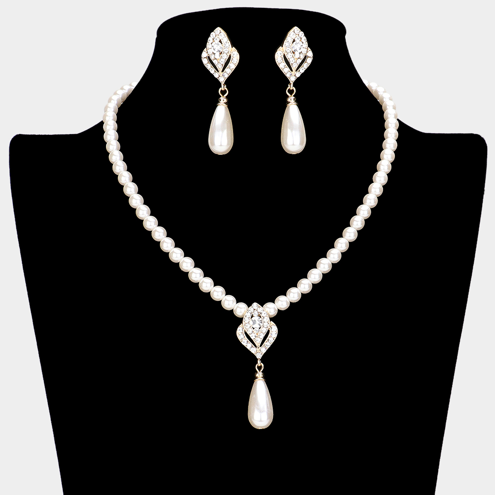 3PCS - Crystal detail pearl strand necklace jewelry set