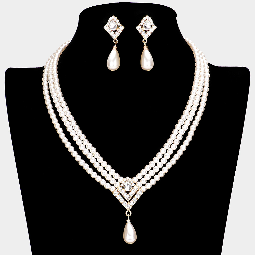 Pearl Heart Pendant Accent Triple Chain Layered Necklace