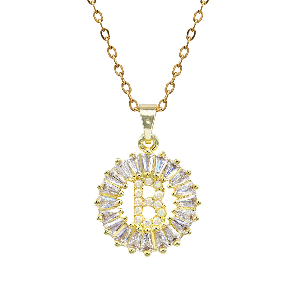 -B- Gold Dipped CZ Stone Paved Initial Monogram Pendant Necklace