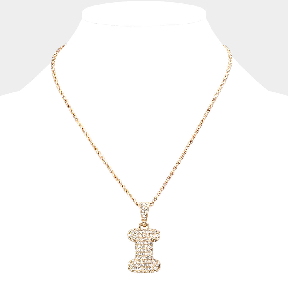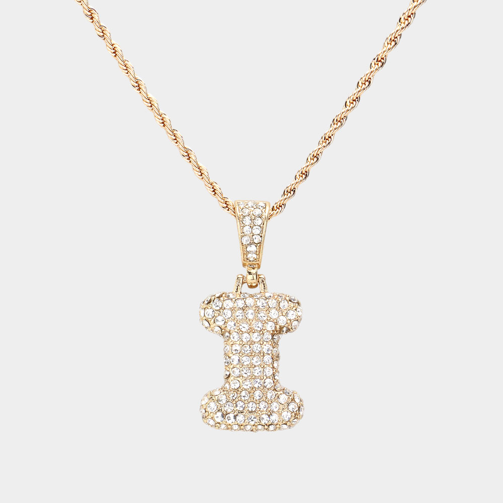 -I- Rhinestone Initial Monogram Pendant Brass Chain Necklace