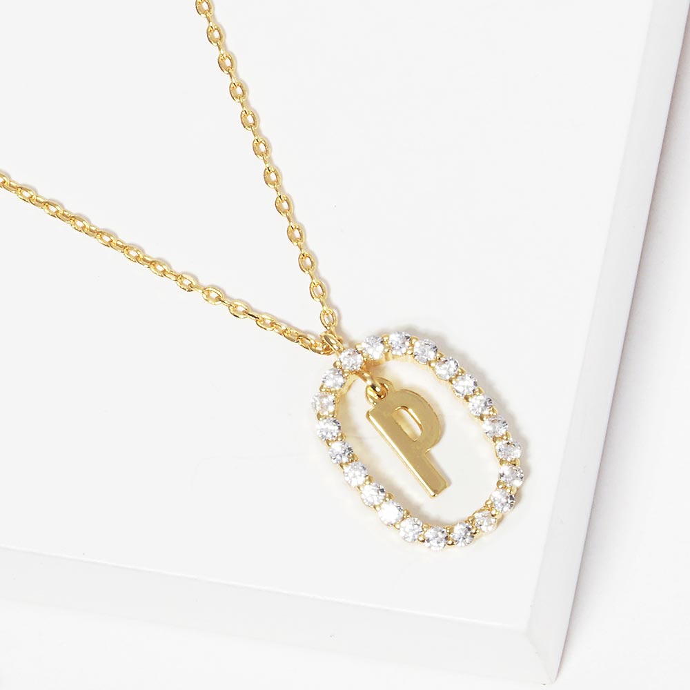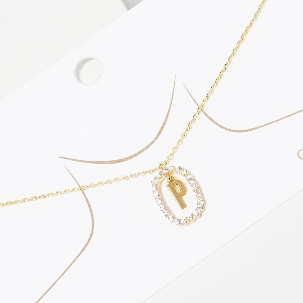-P- Gold Dipped Metal Initial Monogram Rhinestone Oval Link Pendant Necklace