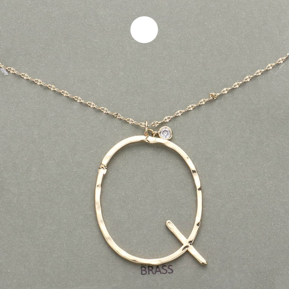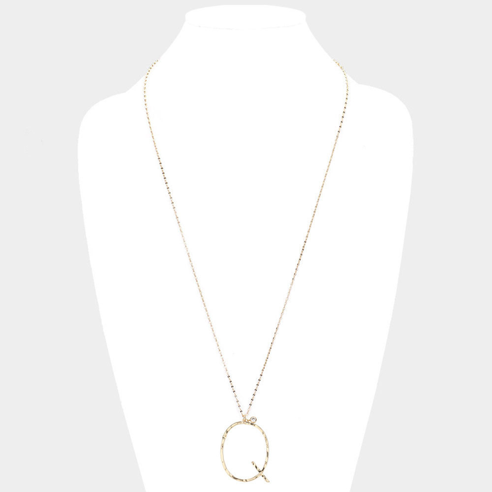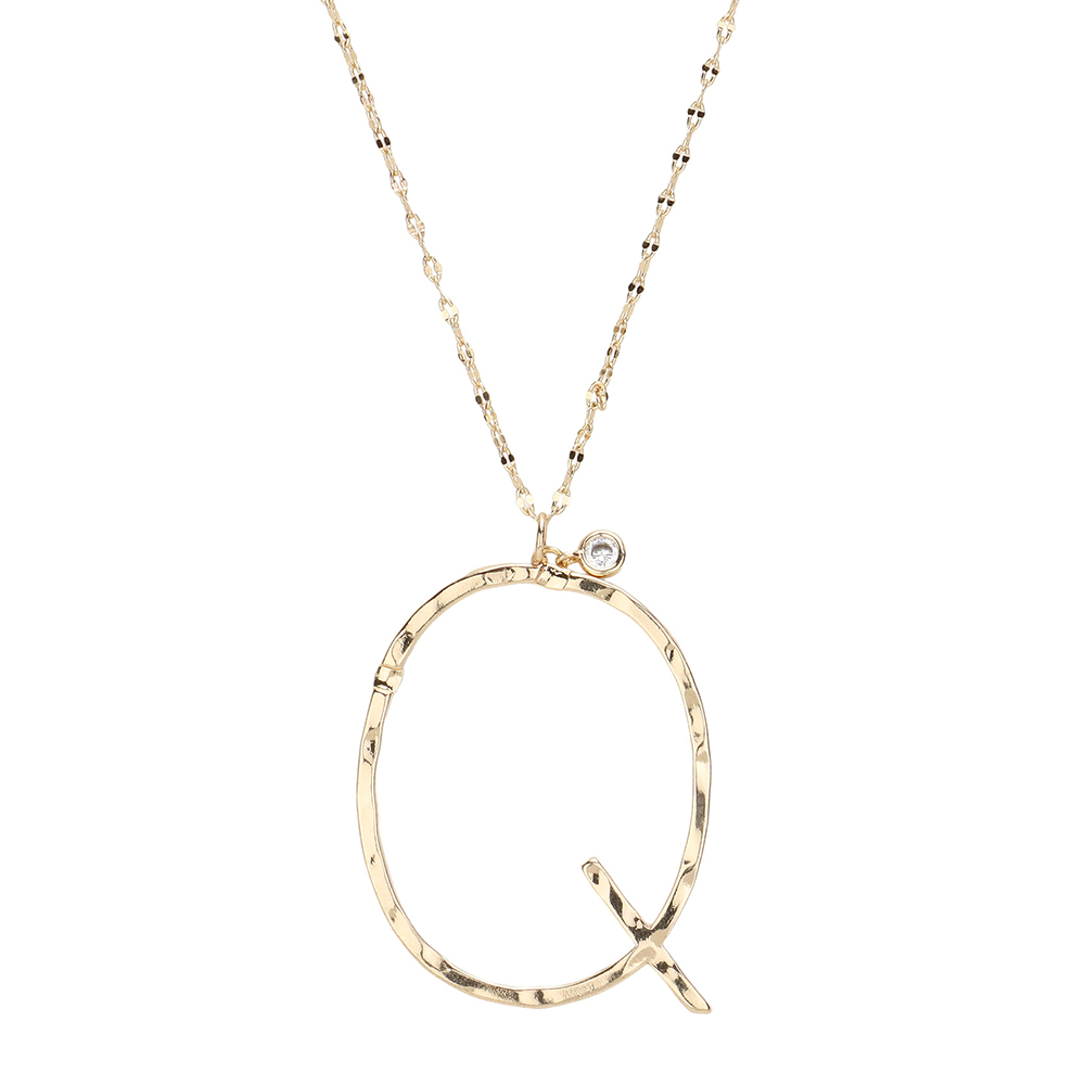 -Q- Rhinestone Initial Monogram Pendant Brass Chain Necklace