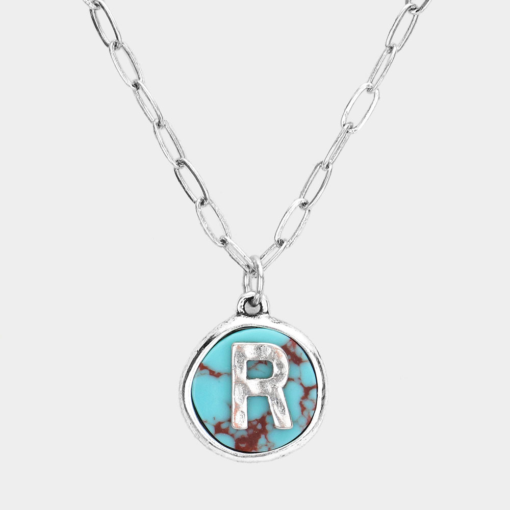 -R- Initial Monogram Turquoise Charm Faceted Beaded Stretch Bracelet