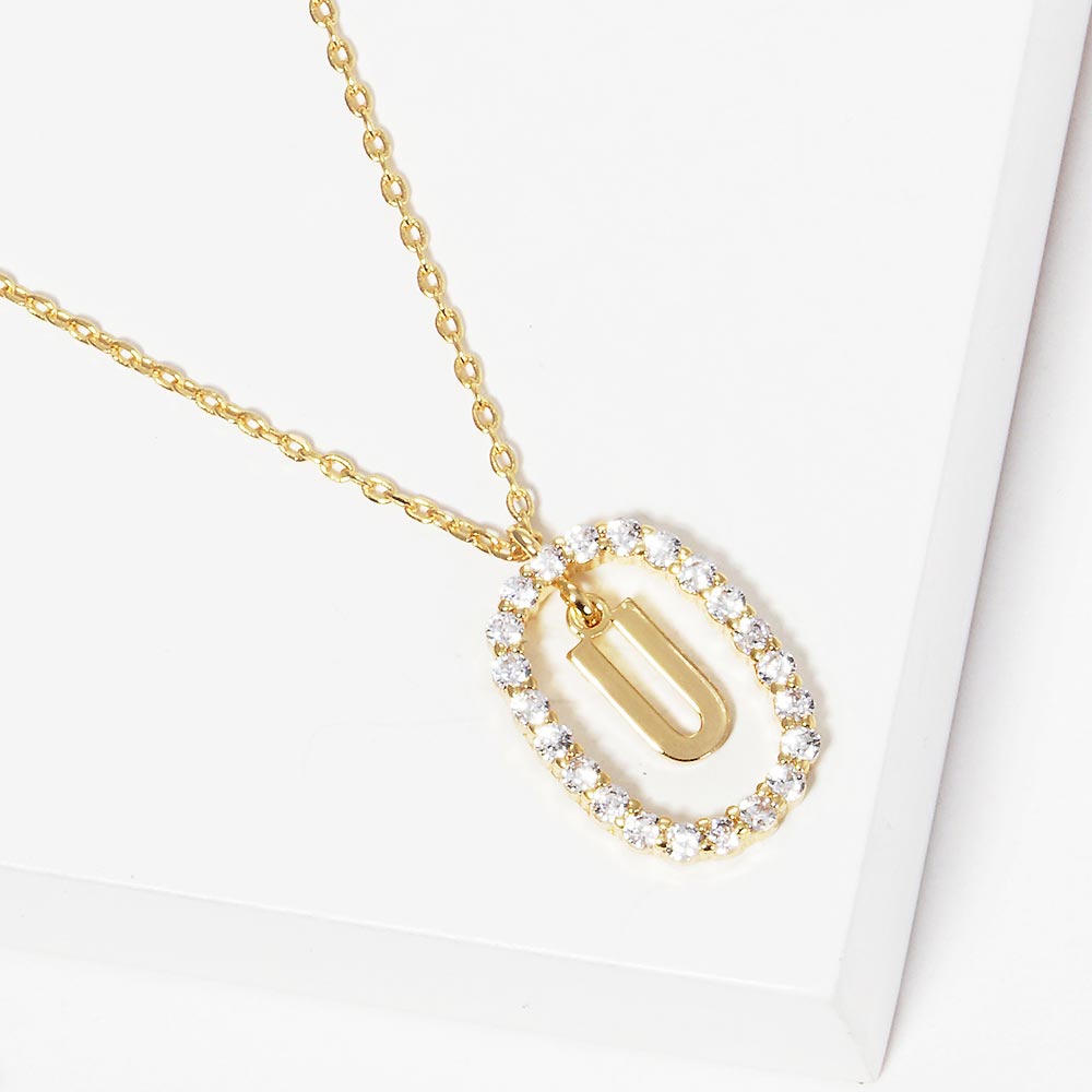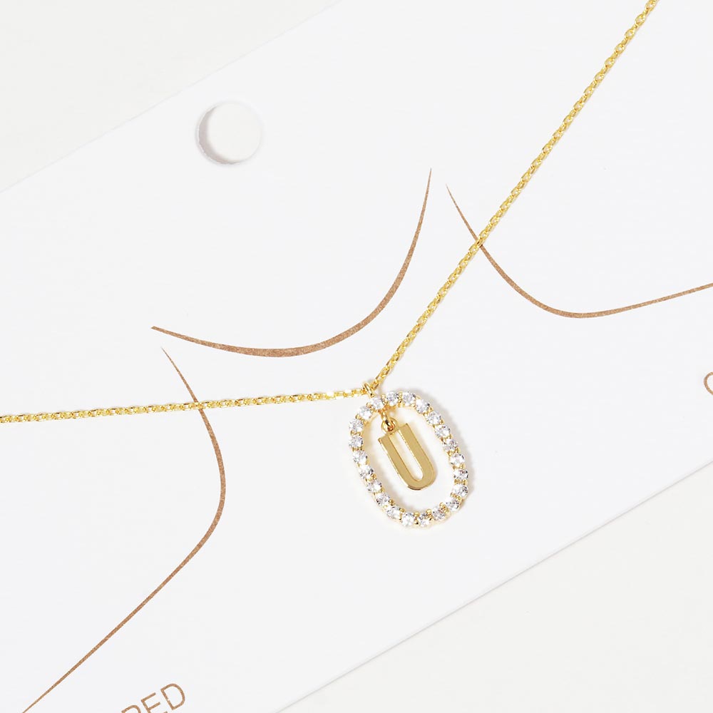 -U- Gold Dipped Metal Initial Monogram Rhinestone Oval Link Pendant Necklace
