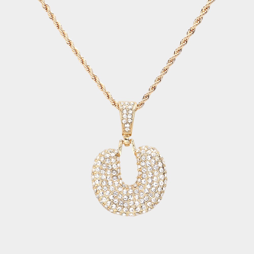 -U- Rhinestone Initial Monogram Pendant Brass Chain Necklace