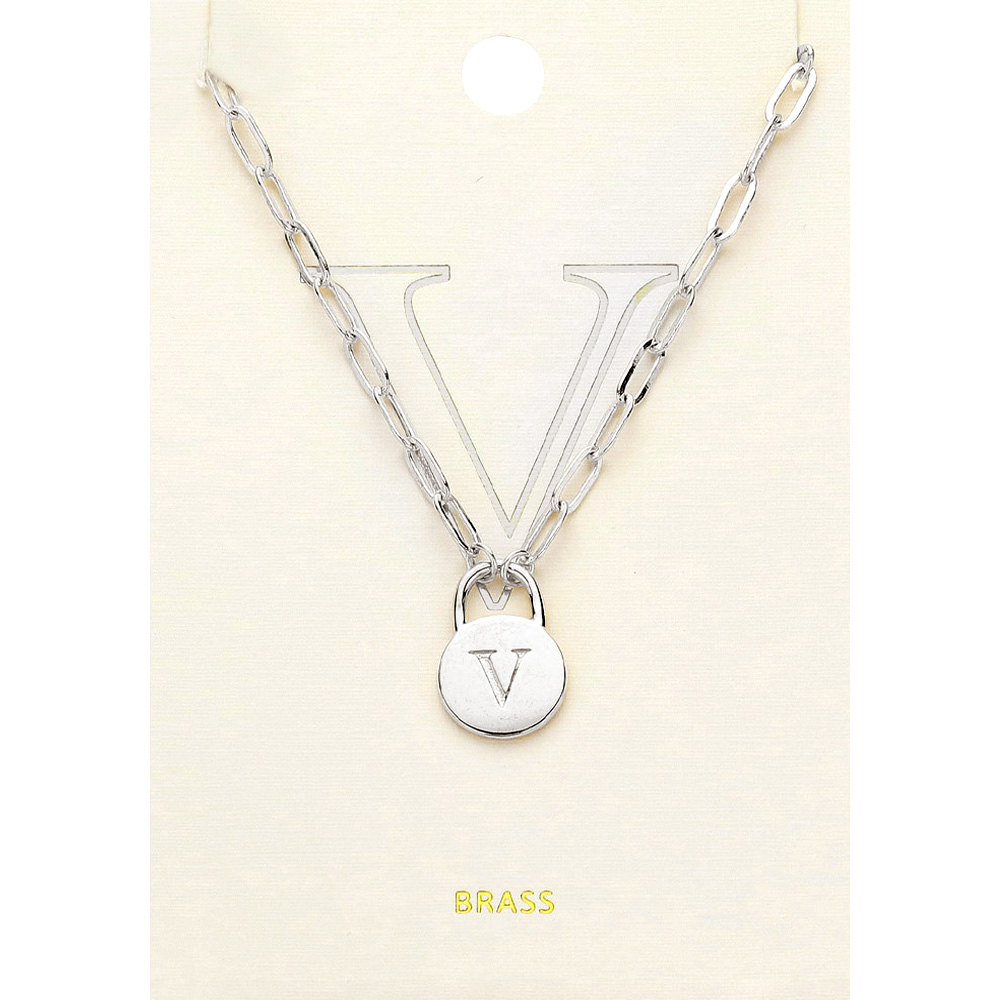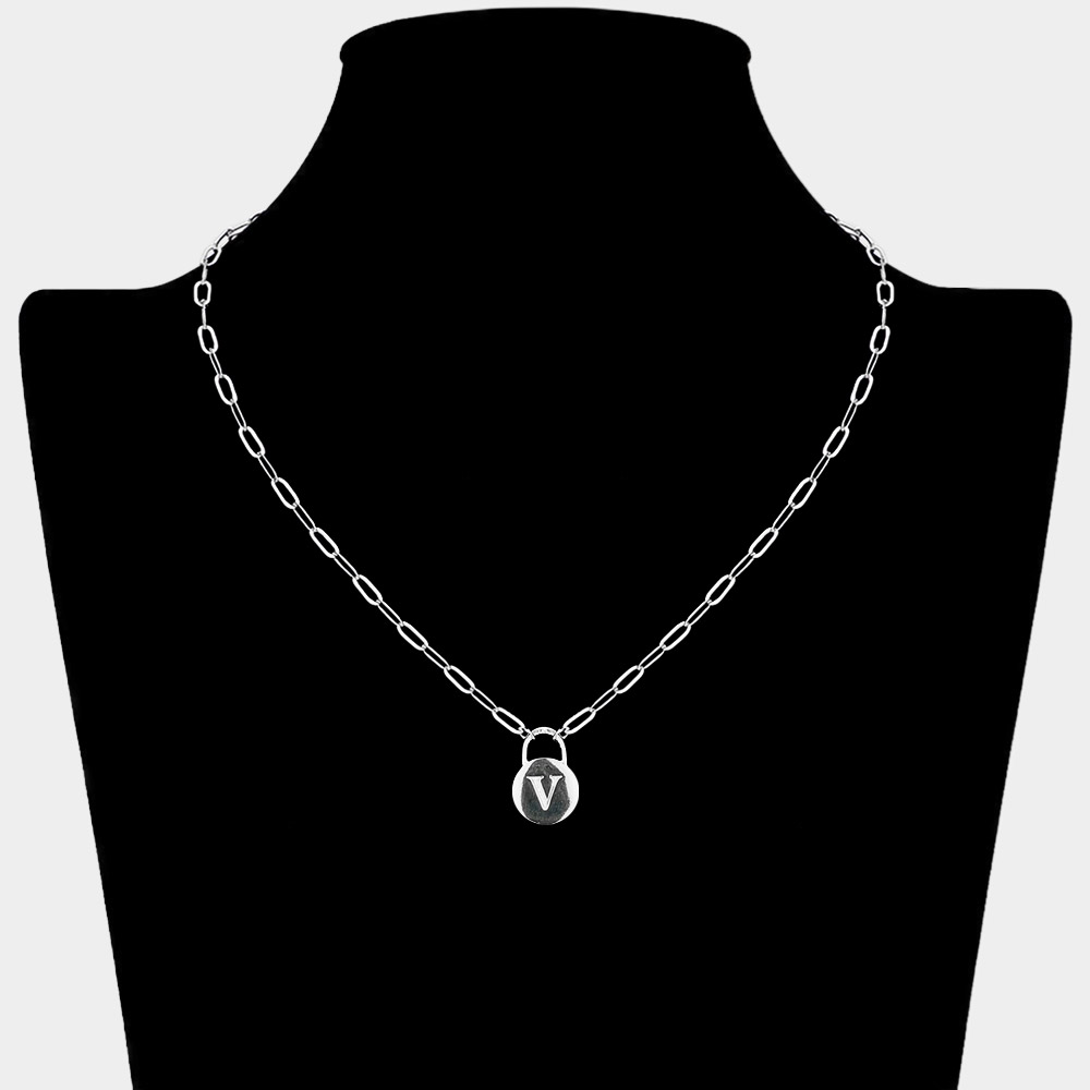 -W- Brass Metal Initial Monogram Lock Pendant Necklace