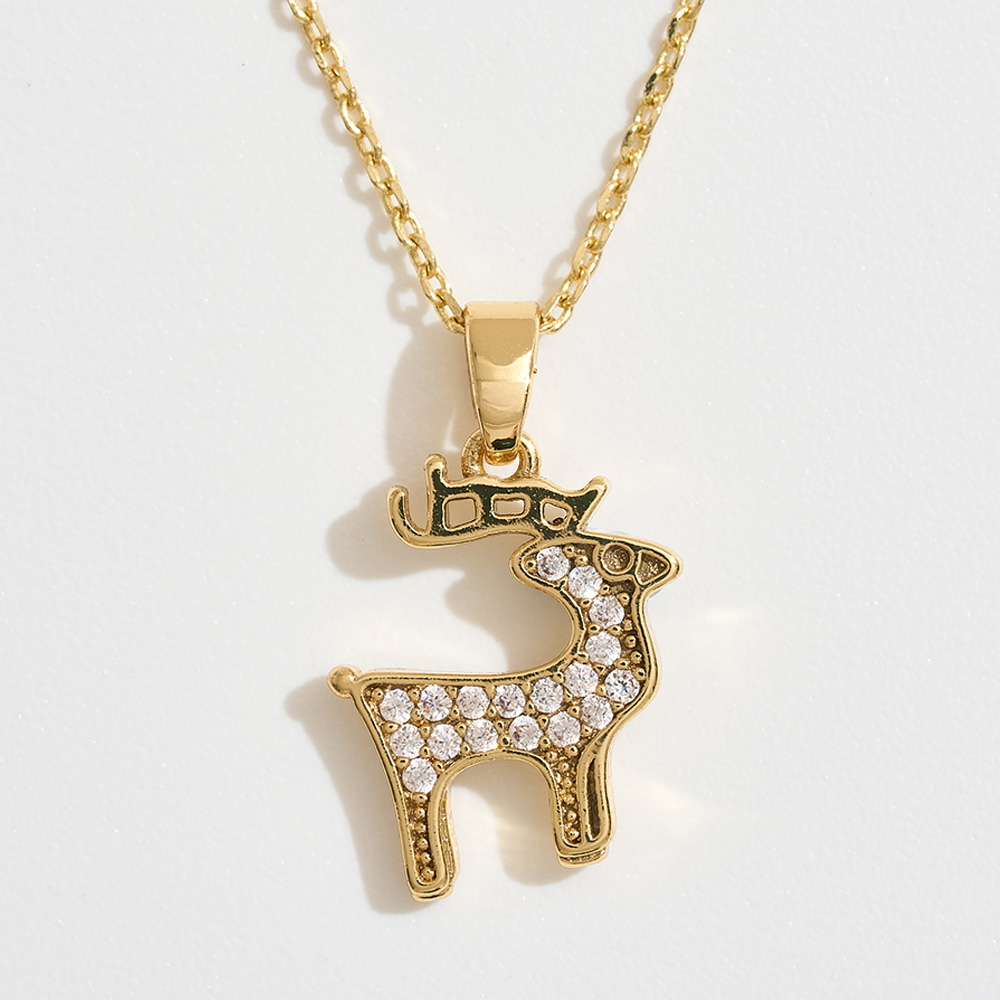 • This reindeer pendant necklace is adorned with shimmering accents, capturing the charm and spirit of the season. A playful yet elegant design, it’s perfect for holiday celebrations or adding a touch of festive sparkle to your everyday jewelry collection.