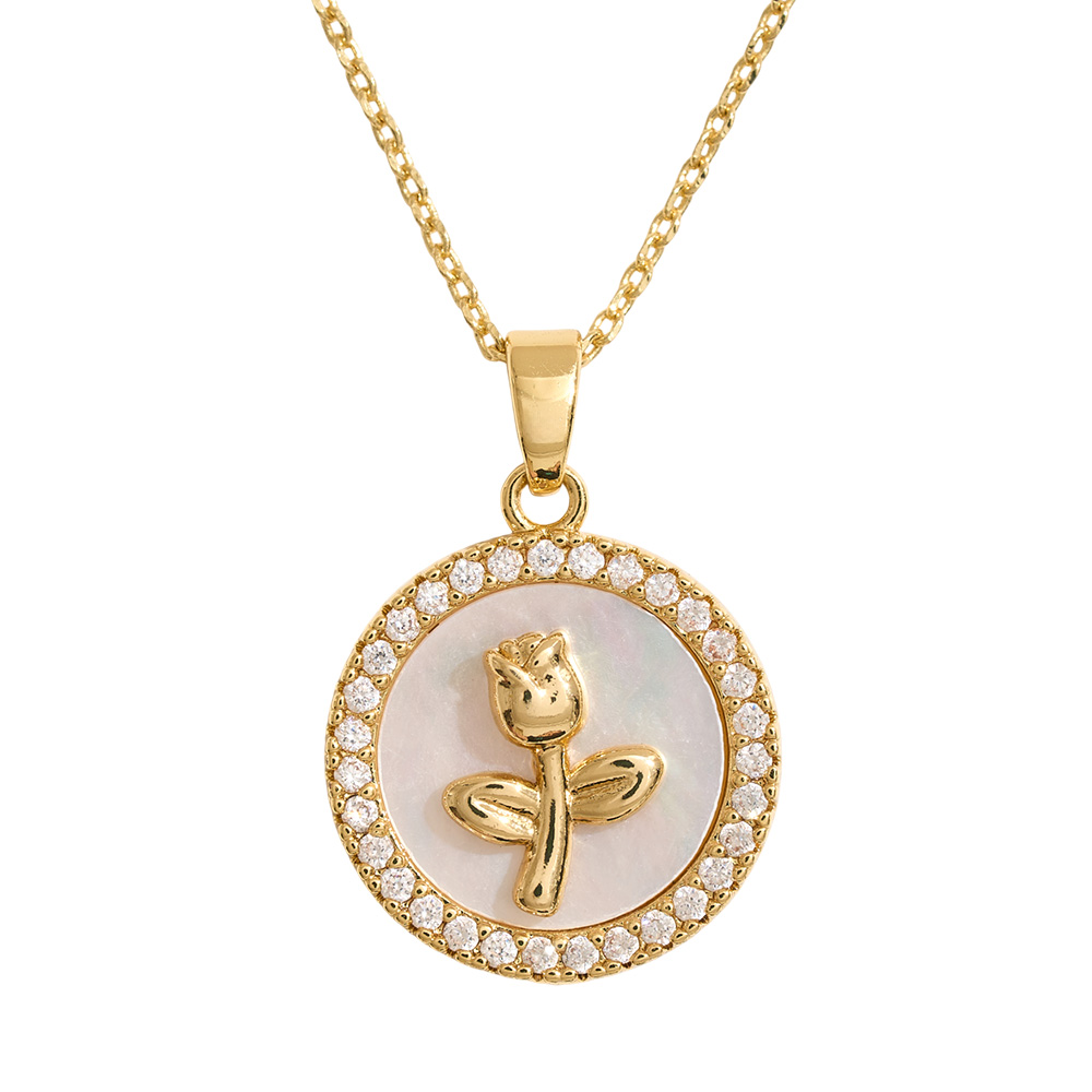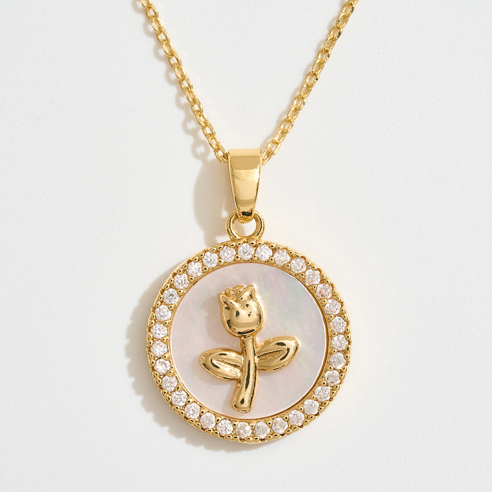 Details • Necklace Size : 16" + 2" L • Pendant Size : 0.7" X 0.8" • This round floral pendant necklace showcases a delicate bloom at its center, framed by a halo of shimmering accents. Designed to radiate elegance and charm, it’s a timeless piece perfect for adding a graceful touch to both everyday wear and special occasions. • CZ Cubic Zirconia • Gold Dipped • Made In Korea
