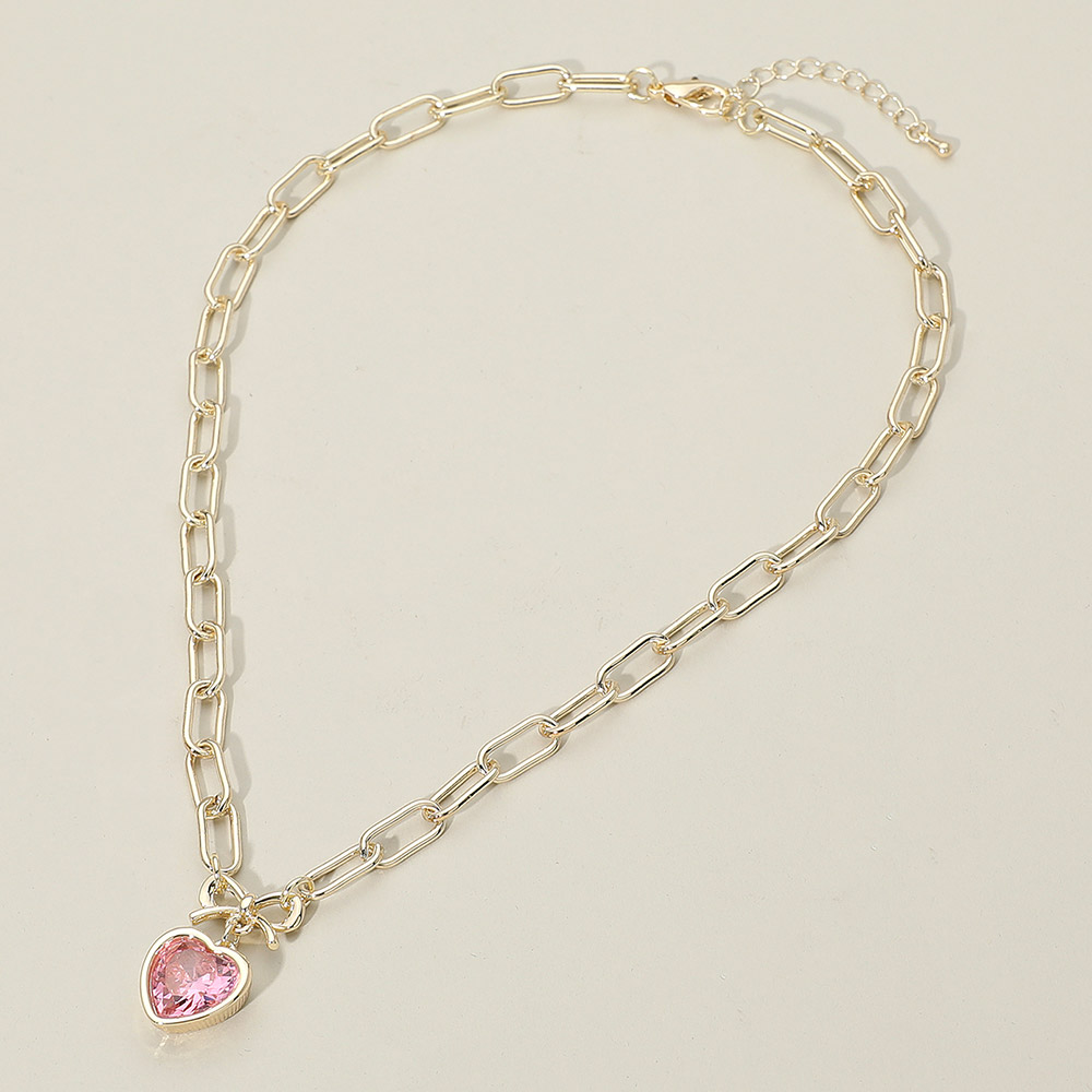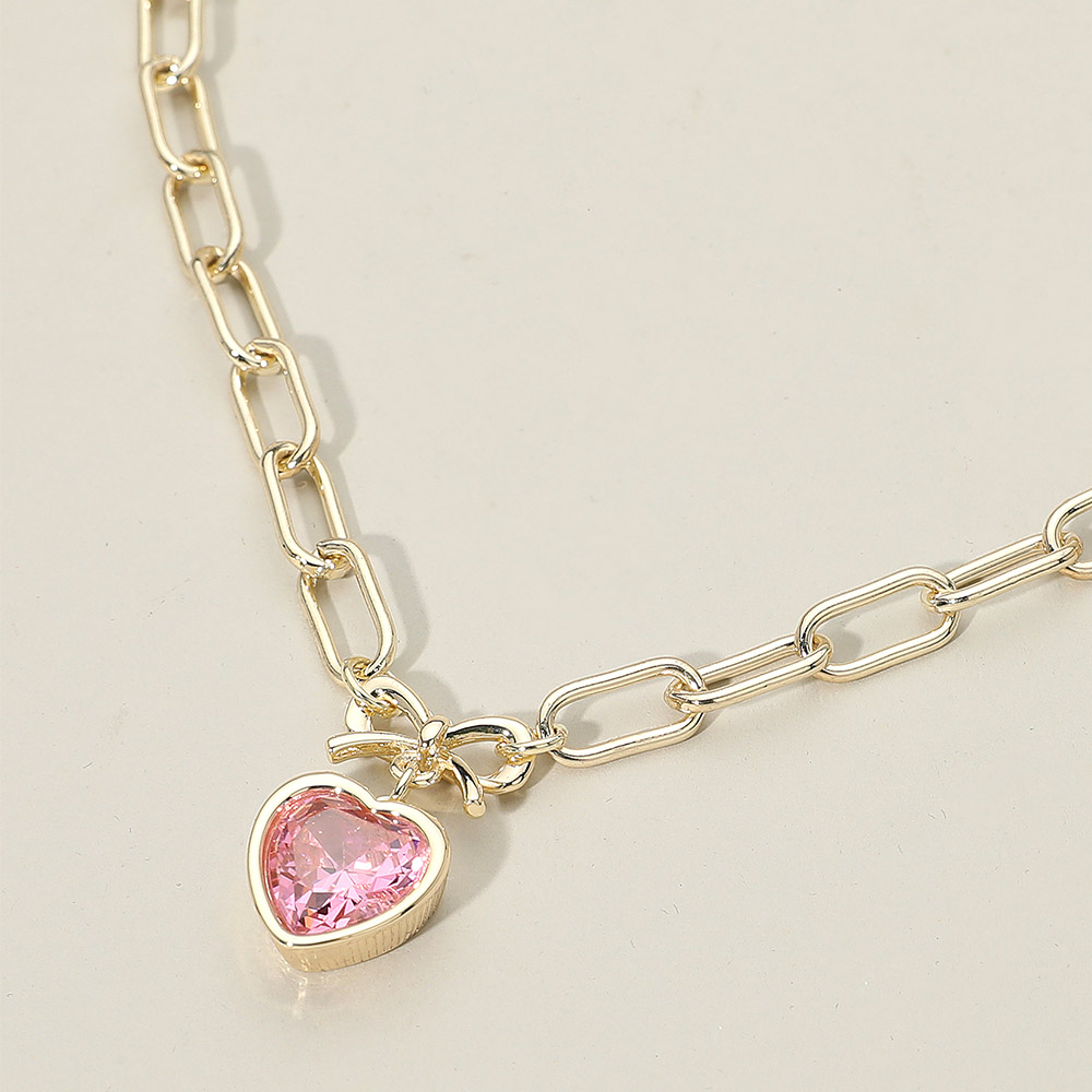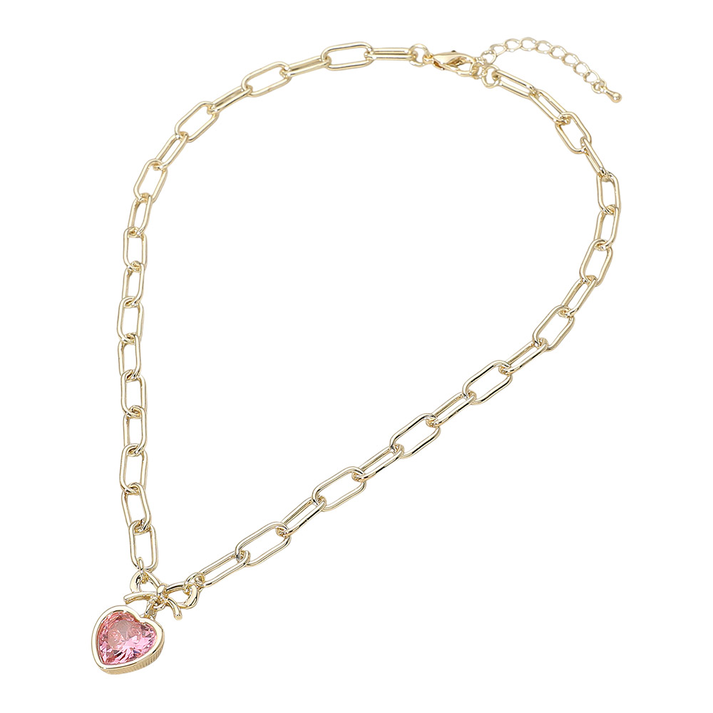 Details • Necklace Size : 17.5" + 2" L • Pendant Size : 0.6" X 1.1" • Elegant heart charm link chain necklace featuring a delicate bow accent and a sparkling heart-shaped cz stone. Designed with a modern elongated link chain for a stylish layered look. A feminine accessory perfect for gifting or everyday wear with timeless romantic appeal. • Gold Dipped • CZ Cubic Zirconia