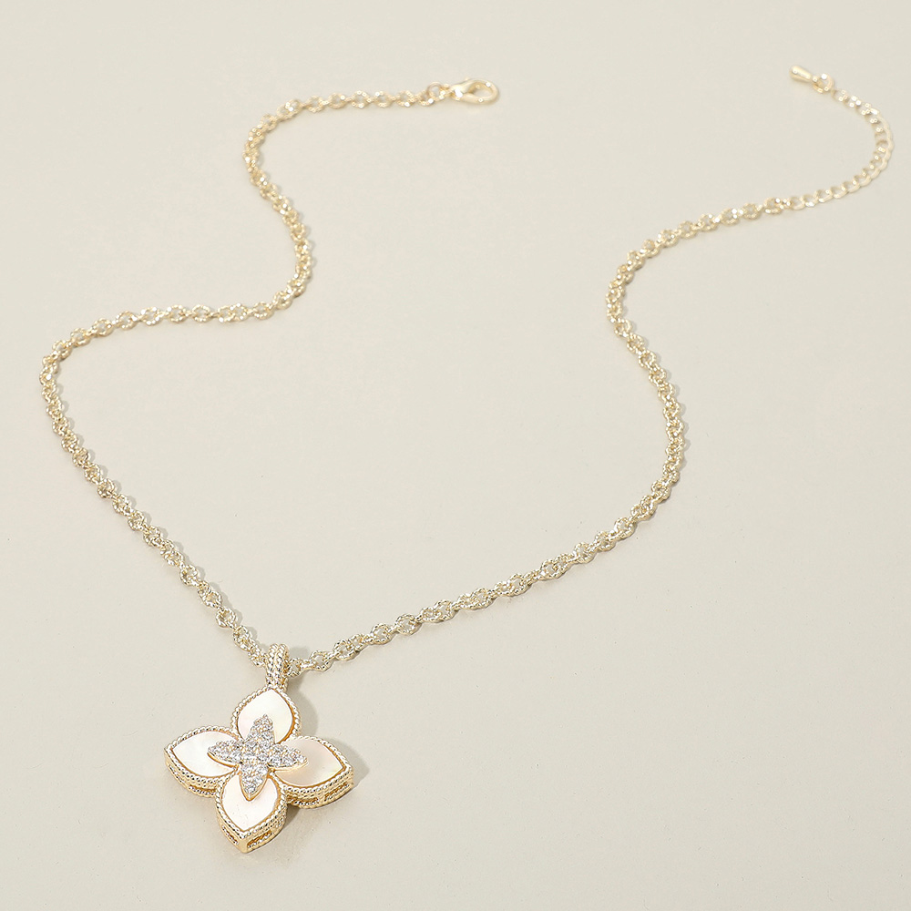 Details • Necklace Size : 17" + 2" L • Pendant Size : 1.25" X 1.5" • This elegant floral pendant necklace features a beautifully detailed petal motif adorned with sparkling crystal accents. Its timeless design and delicate craftsmanship make it perfect for adding a refined touch to both everyday ensembles and special occasions. • CZ Cubic Zirconia • Gold Dipped