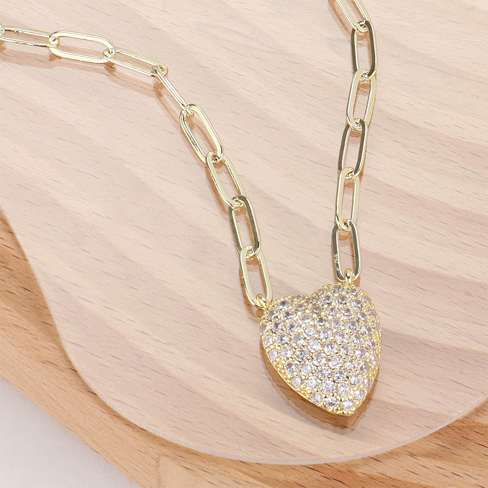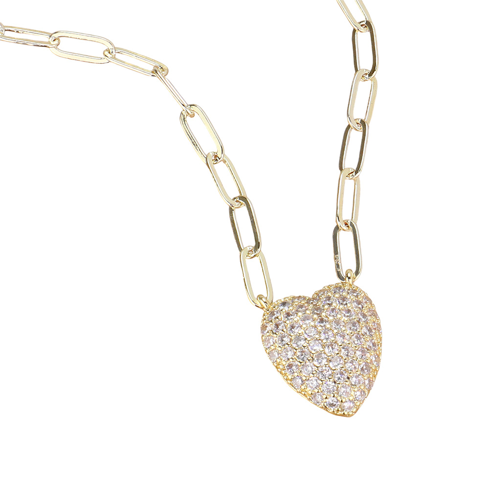 14K Gold Plated CZ Stone Paved Heart Pendant Paperclip Chain Necklace