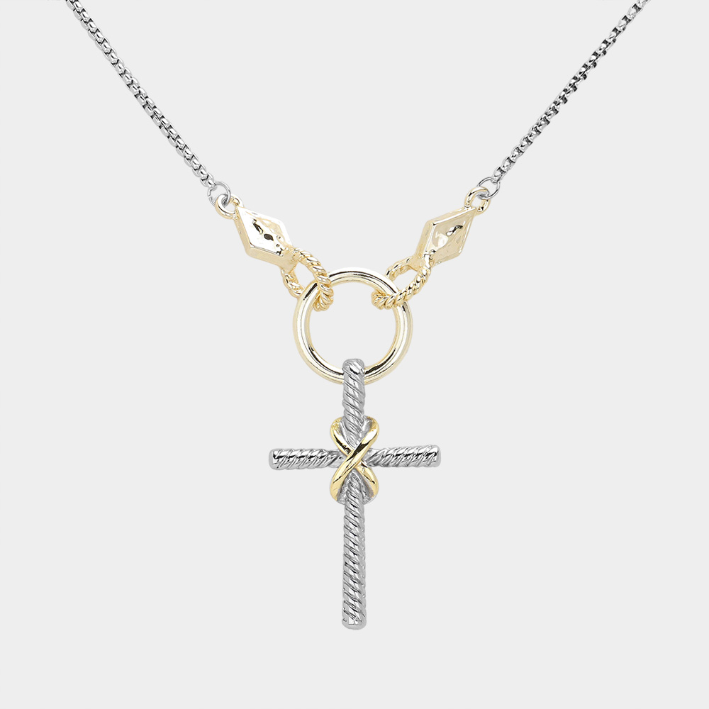 Two Tone Metal Intricate Scroll Cross Stone Cluster Charm Embellished Necklace
