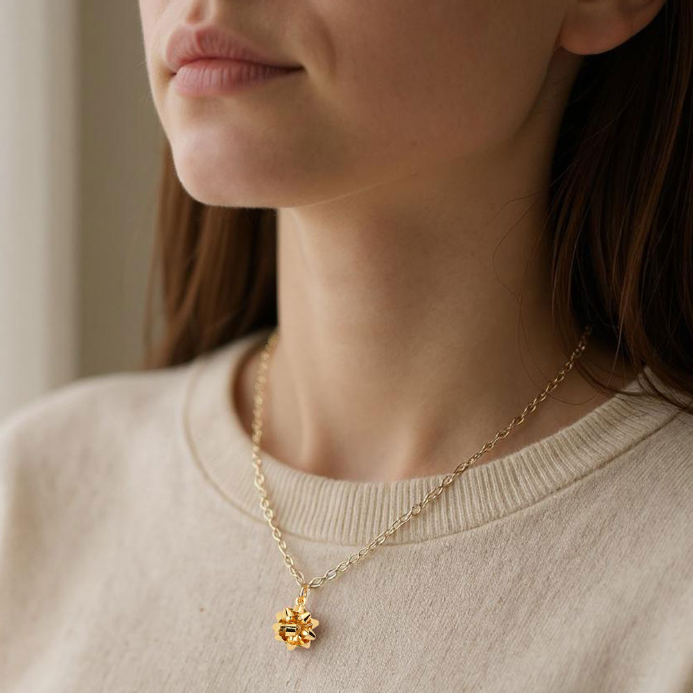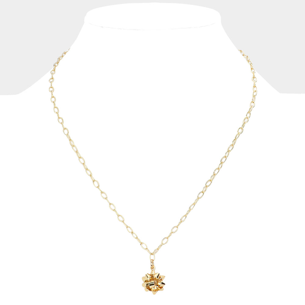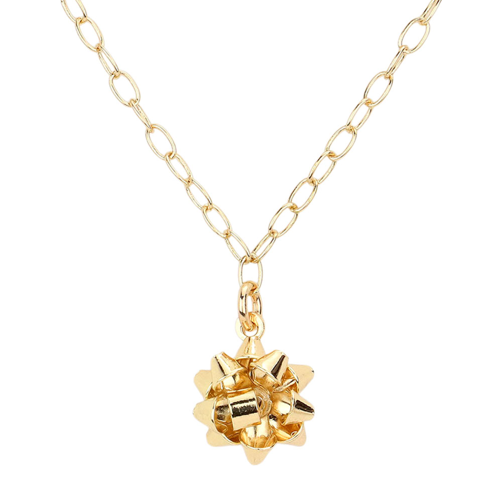 Details • Necklace Size : 16" L + 3" L • Pendant Size : 0.5" X 0.6" • Delicate silver chain necklace featuring a shiny gift bow pendant—perfect for holiday gifting, festive looks, or adding charm to everyday wear. • Gold Dipped • Lead and Nickel Compliant
