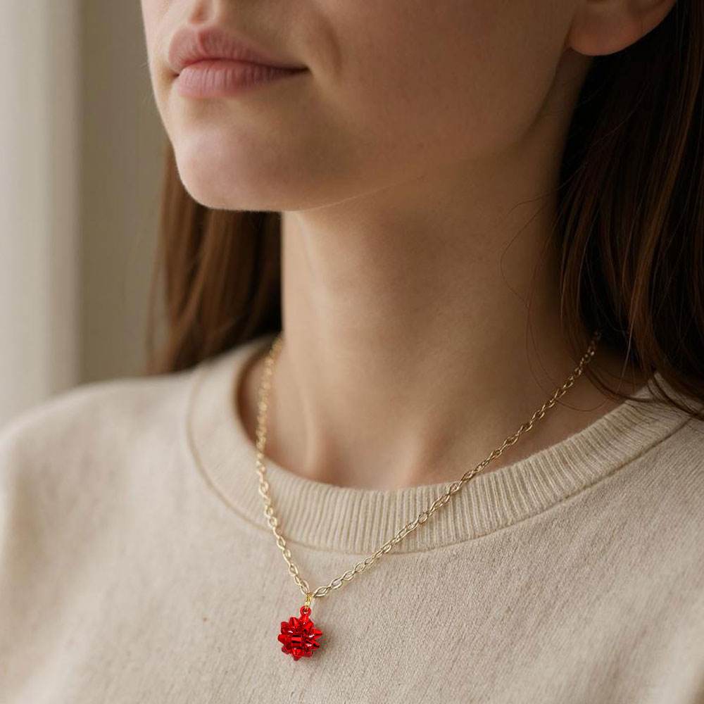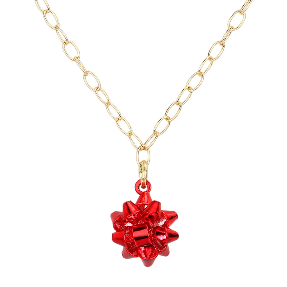 Details • Necklace Size : 16" L + 3" L • Pendant Size : 0.5" X 0.6" • Delicate silver chain necklace featuring a shiny gift bow pendant—perfect for holiday gifting, festive looks, or adding charm to everyday wear. • Gold Dipped • Lead and Nickel Compliant