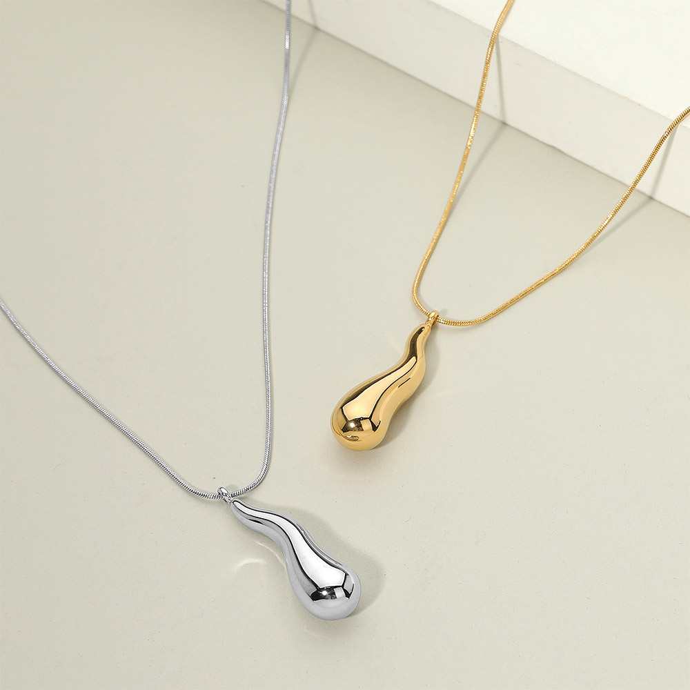 Details • Necklace Size : 16" + 2" L • Pendant Size : 0.4" X 1.4" • This stainless steel necklace features a sleek teardrop pendant with a polished finish, offering a minimalist yet striking design. Perfect for elevating both casual and dressy looks, its refined silhouette and durable build make it an elegant everyday accessory. • Gold Dipped • Stainless Steel