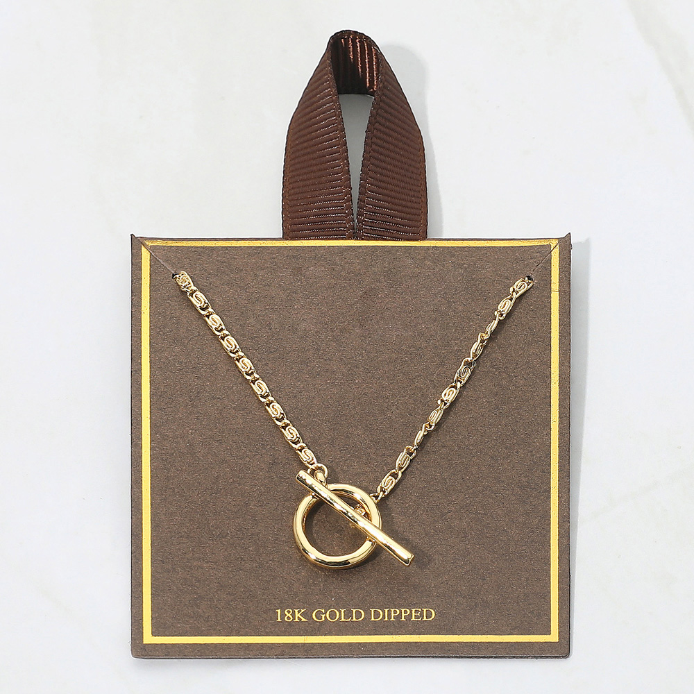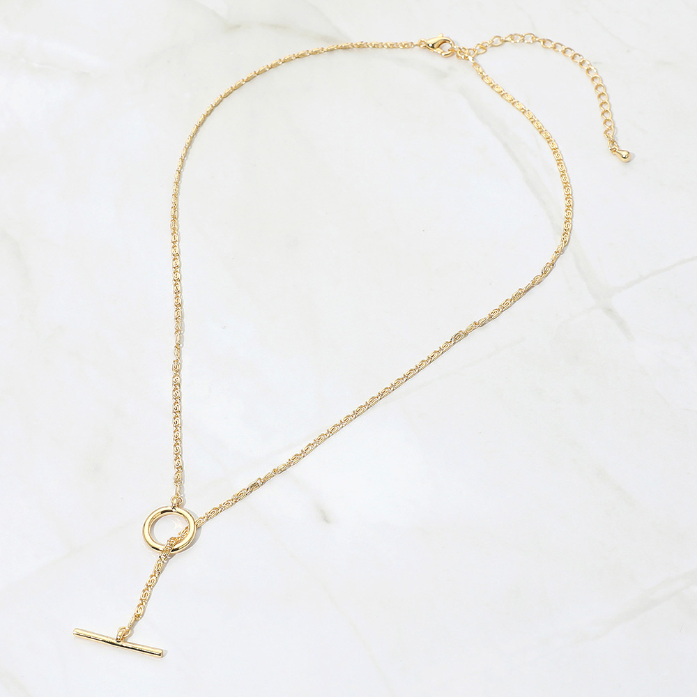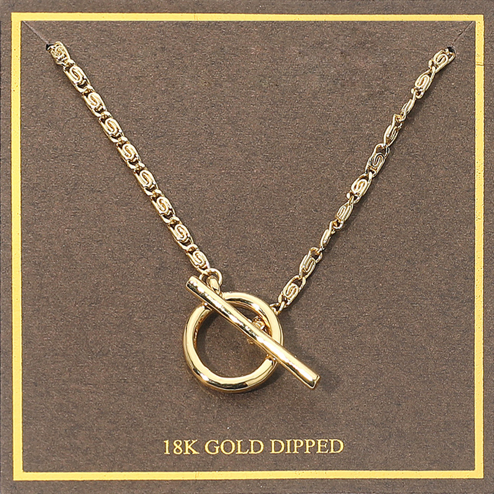Details • Necklace Size : 17" + 3.5" L • Pendant Size : 0.8" L • Modern toggle pendant necklace featuring a stylish circle and bar design on a delicate chain. Its contemporary look makes it a versatile accessory for layering or wearing solo, perfect for casual elegance or adding a refined touch to dressy outfits, making it a thoughtful gift choice too. • Gold Dipped • Lead and Nickel Compliant