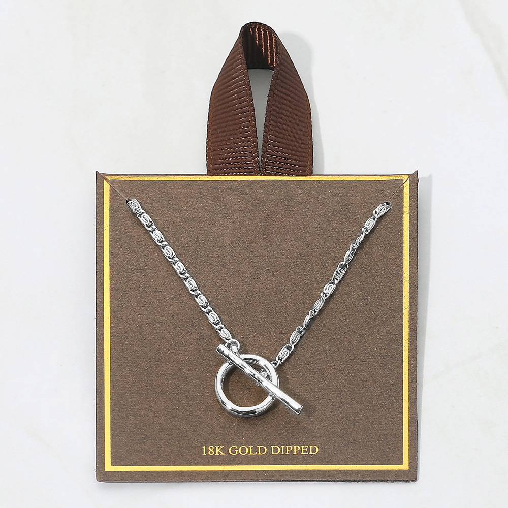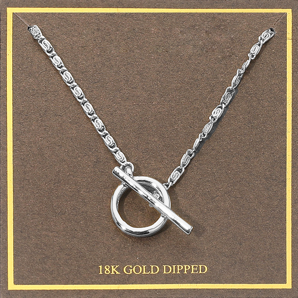 Details • Necklace Size : 17" + 3.5" L • Pendant Size : 0.8" L • Modern toggle pendant necklace featuring a stylish circle and bar design on a delicate chain. Its contemporary look makes it a versatile accessory for layering or wearing solo, perfect for casual elegance or adding a refined touch to dressy outfits, making it a thoughtful gift choice too. • Gold Dipped • Lead and Nickel Compliant