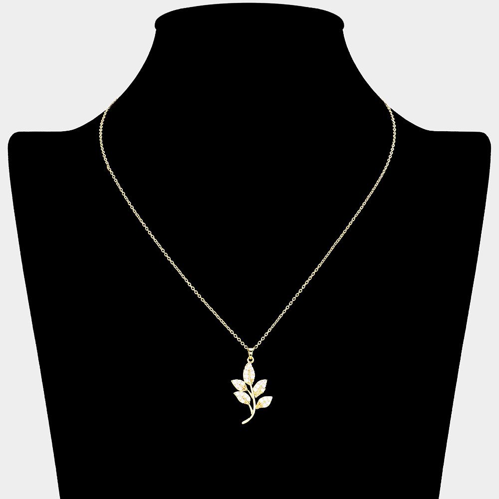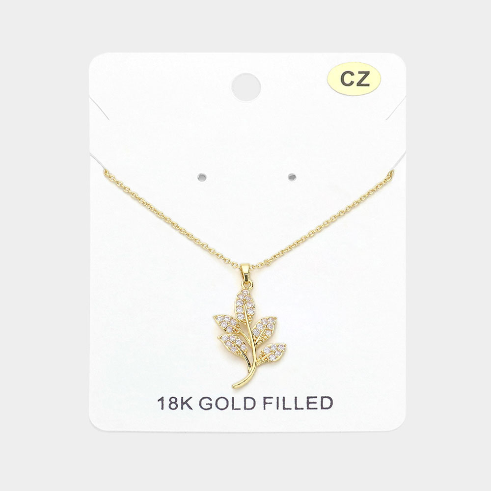 18K Gold Filled CZ Stone Paved Leaf Pendant Necklace