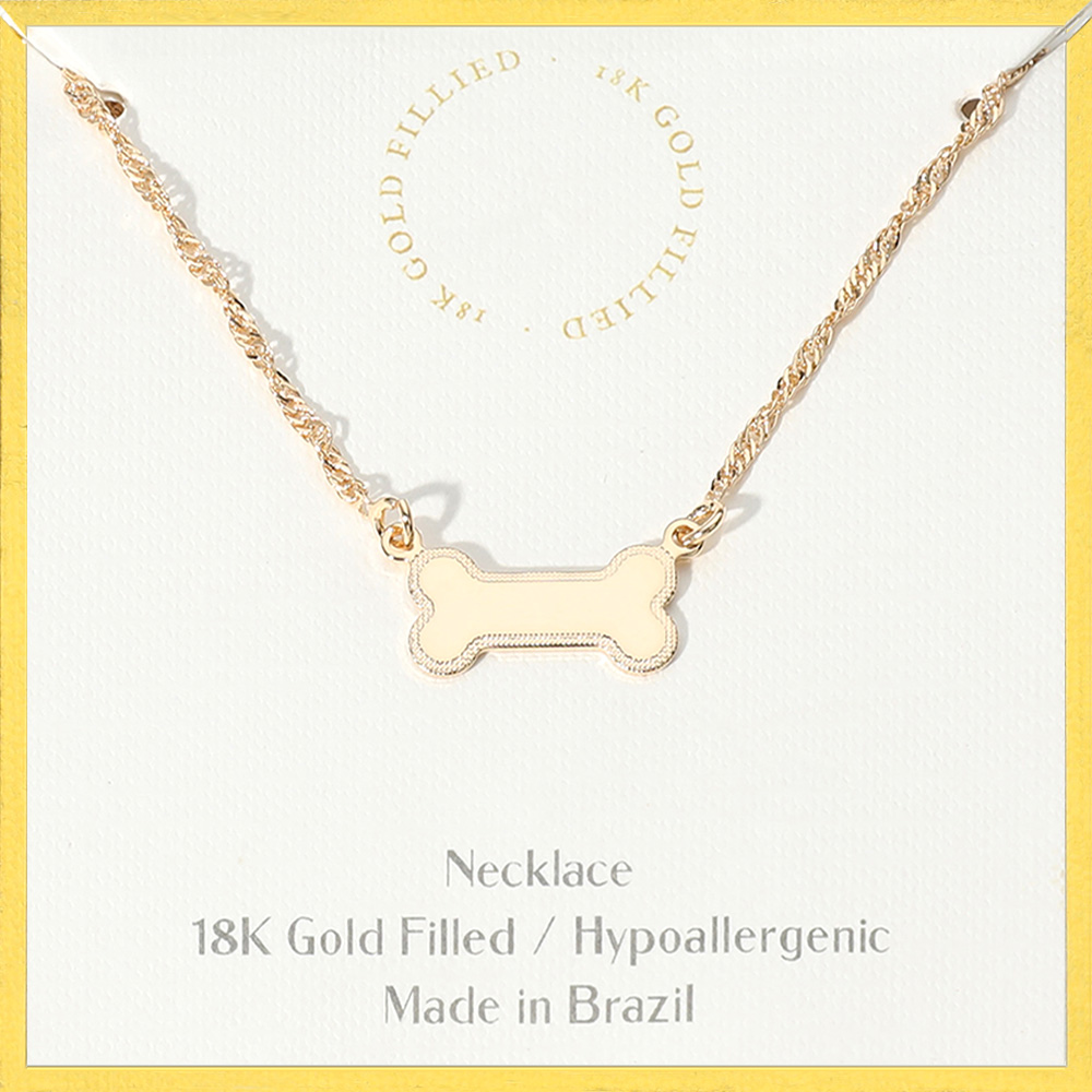 Details • Necklace Size : 18.5" + 2" • Pendant Size : 0.9" X 0.3" • Water resistant and tarnish free • Chic necklace featuring a dog bone charm, ideal for pet lovers and everyday wear. A playful yet elegant accessory that adds personality to your style while keeping your love for furry friends close to heart. • Lead and Nickel Compliant • Hypoallergenic • Gold Filled • Made In Brazil