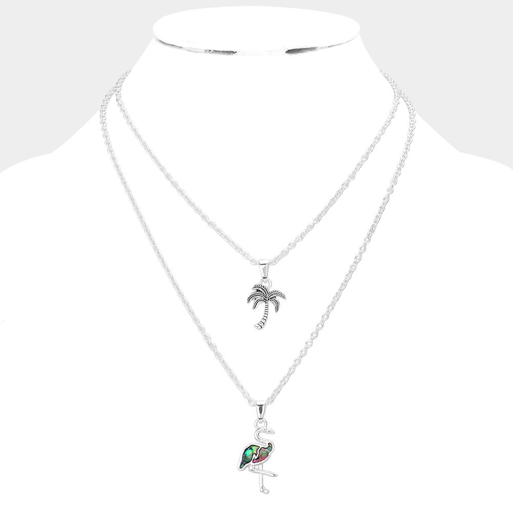 2PCS - Antique Metal Palm Tree Abalone Flamingo Pendant Necklace