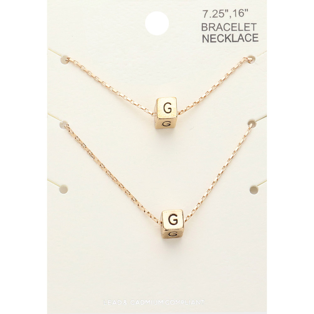 2PCS - -G- Initial Monogram Metal Cube Pendant Necklace / Bracelet Set