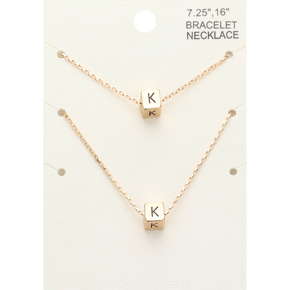 2PCS - -K- Initial Monogram Metal Cube Pendant Necklace / Bracelet Set