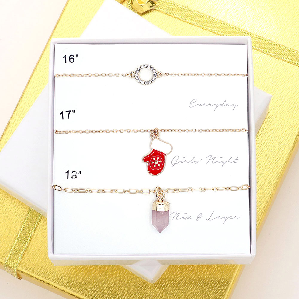 Details • Size 1 : 0.4" X 0.4", 16" + 2" L • Size 2 : 0.5" X 0.75", 17" + 2" L • Size 3 : 0.3" X 0.8", 18" + 2" L • Lobster Clasp Closure • Stylish layered necklace set featuring three delicate chains with unique pendants including a charm, gemstone, and accent detail. Perfect for everyday wear or gifting, offering versatile and trendy style.