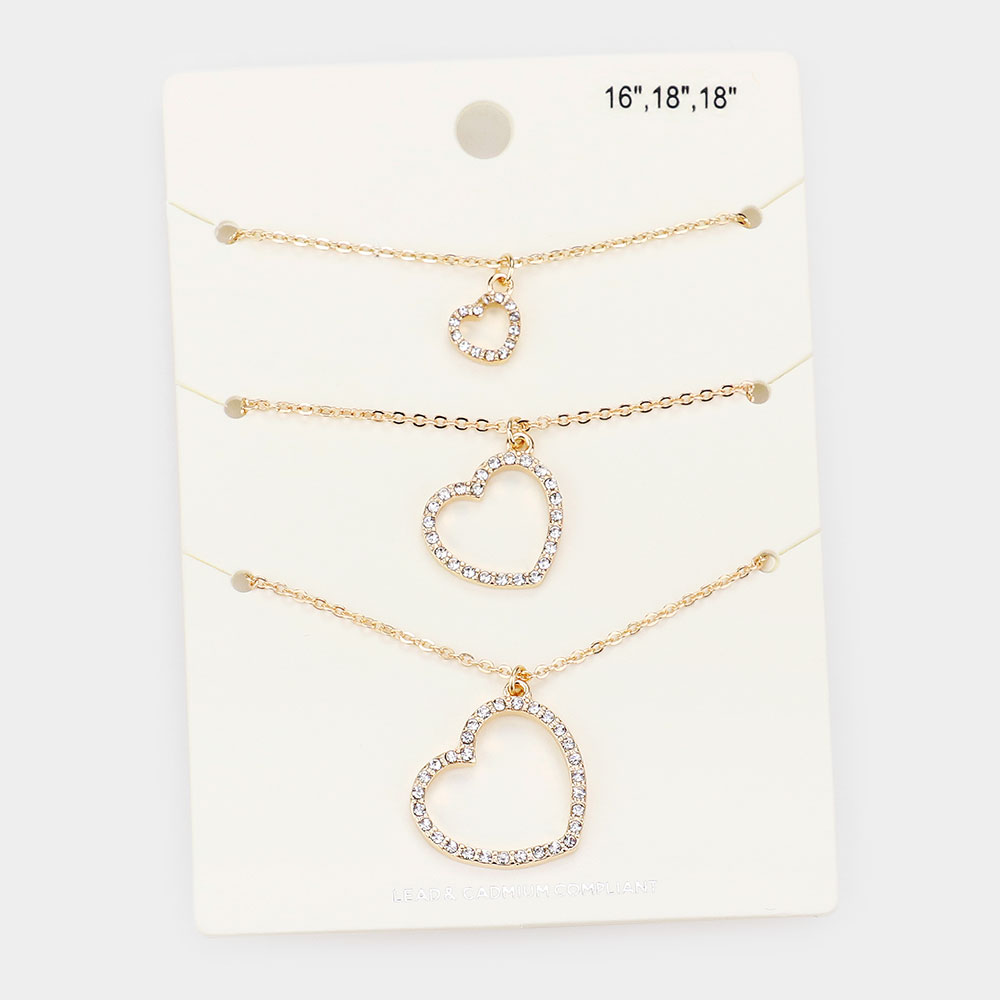 3PCS - Rhinestone Embellished Open Heart Pendant Necklaces