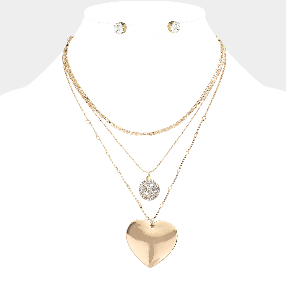 3PCS - Stone Embellished Smile Metal Heart Pendant Necklaces