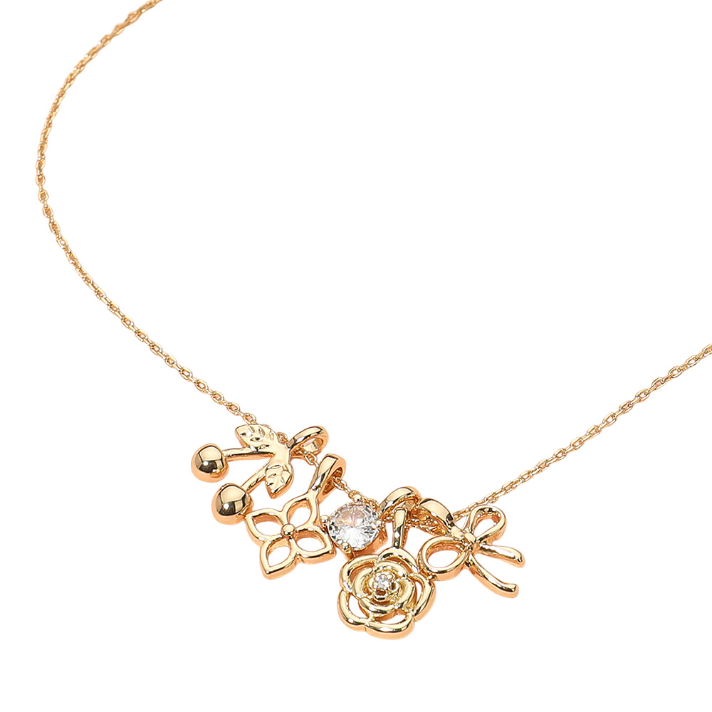Details • Necklace Size : 15.5" + 2.5" L • Charm Size : 0.3" - 0.5" L • This charm necklace showcases a playful mix of floral, bow, and cherry motifs accented with sparkling details. A versatile piece that blends elegance with whimsy, it adds a unique touch to any outfit. Perfect for layering or wearing solo as a statement accessory. • Brass • CZ Cubic Zirconia • Lead and Nickel Compliant