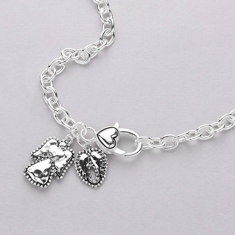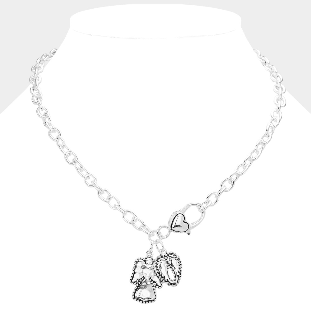 Details • Necklace Size : 17" L • Pendant Size : 0.6" X 1.25" • Bring a touch of meaning to your style with this angel and heart charm chain necklace featuring detailed pendants on a bold link chain. Complete with a heart-shaped clasp, this versatile accessory is perfect for layering or wearing solo as a standout everyday piece. • Lead and Nickel Compliant