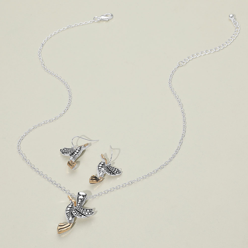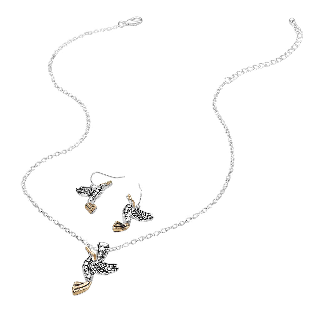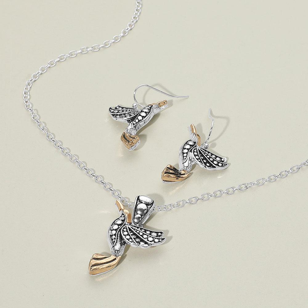 Details • Necklace Size : 18" + 3" L • Pendant Size : 0.9" X 1.4" • Earrings Size : 1.25" L • Elegant bird pendant necklace with matching earrings, featuring intricate detailing that captures the beauty of nature. A perfect gift for bird lovers and a stylish accessory for everyday or special occasions. • Lead and Nickel Compliant