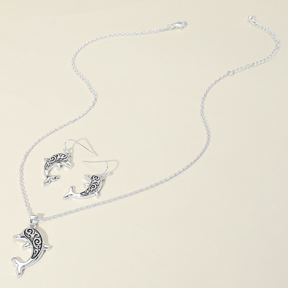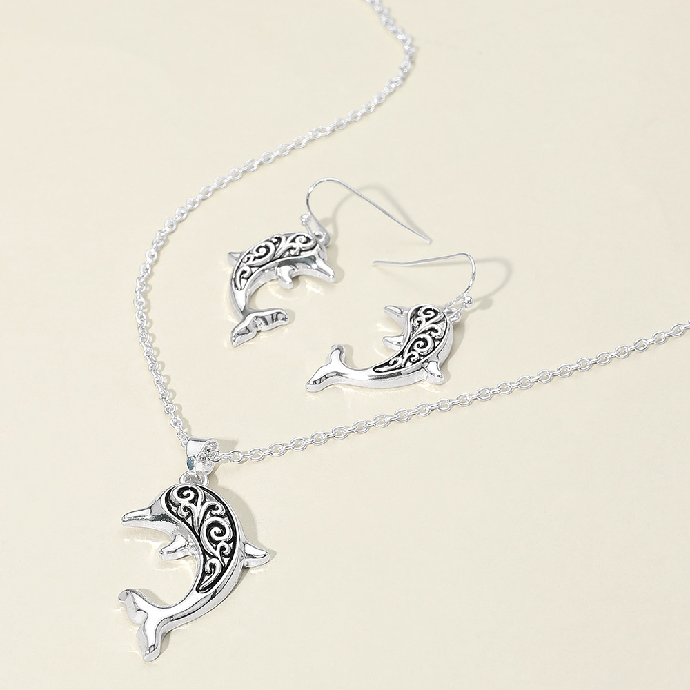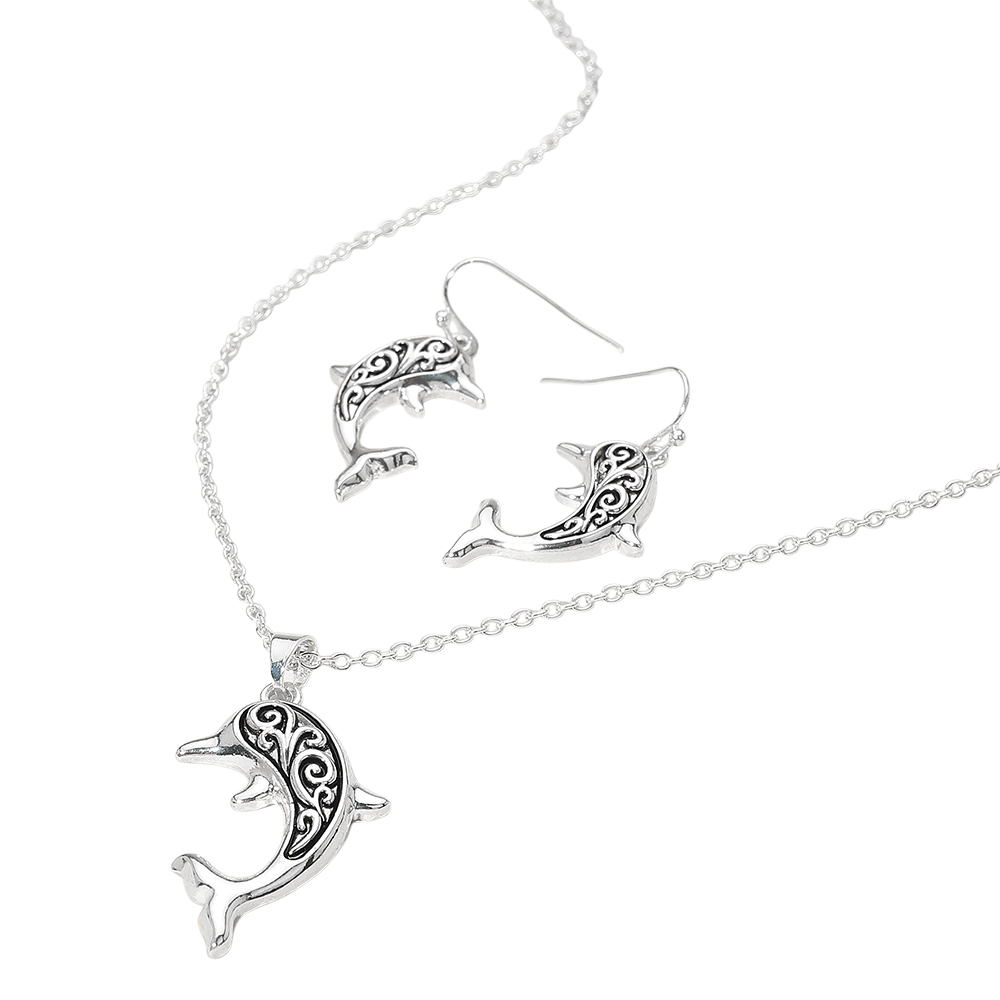 Details • Necklace Size : 18" + 3.25" L • Pendant Size : 0.9" X 1.5" • Earrings Size : 1.5" L • Charming dolphin jewelry set featuring a matching pendant necklace and drop earrings with intricate swirl accents. Adds a playful yet elegant touch to any outfit, making it perfect for beach lovers or ocean-inspired style. A delightful gift idea for special occasions or everyday wear. • Lead and Nickel Compliant