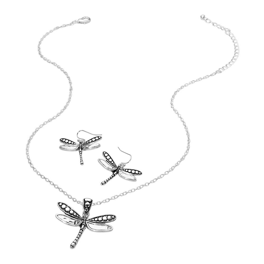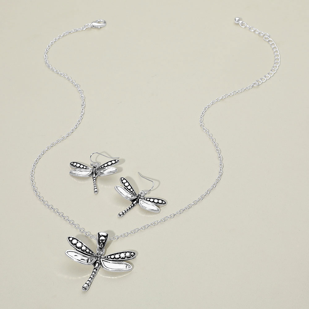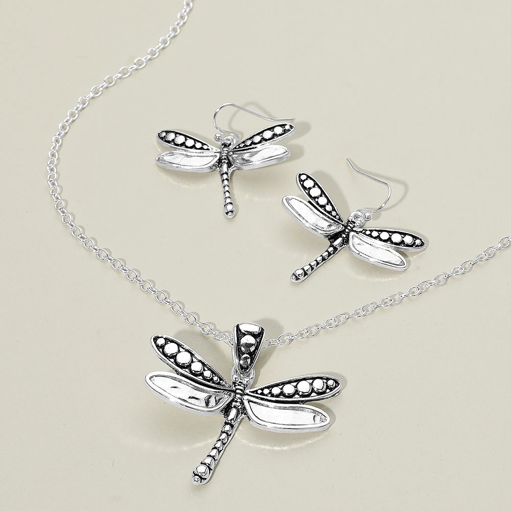 Details • Necklace Size : 18" + 3" L • Pendant Size : 1.5" X 1.5" • Earrings Size : 1.25" L • Elegant dragonfly pendant necklace paired with matching earrings, designed with delicate details for a graceful, nature-inspired look. Ideal for everyday wear or as a thoughtful gift for nature lovers. • Lead and Nickel Compliant