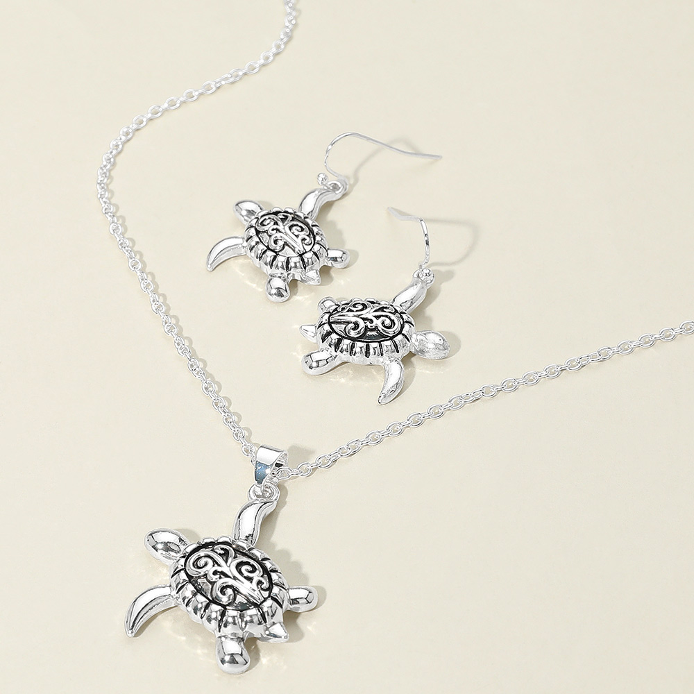 Details • Necklace Size : 18" + 3.25" L • Pendant Size : 1" X 1.5" • Earrings Size : 1.4" L • Adorable sea turtle jewelry set featuring a matching pendant necklace and drop earrings with intricate swirl detailing. Perfect for ocean lovers and those inspired by marine life, this charming accessory adds a whimsical touch to any look and makes a thoughtful gift for any occasion. • Lead and Nickel Compliant
