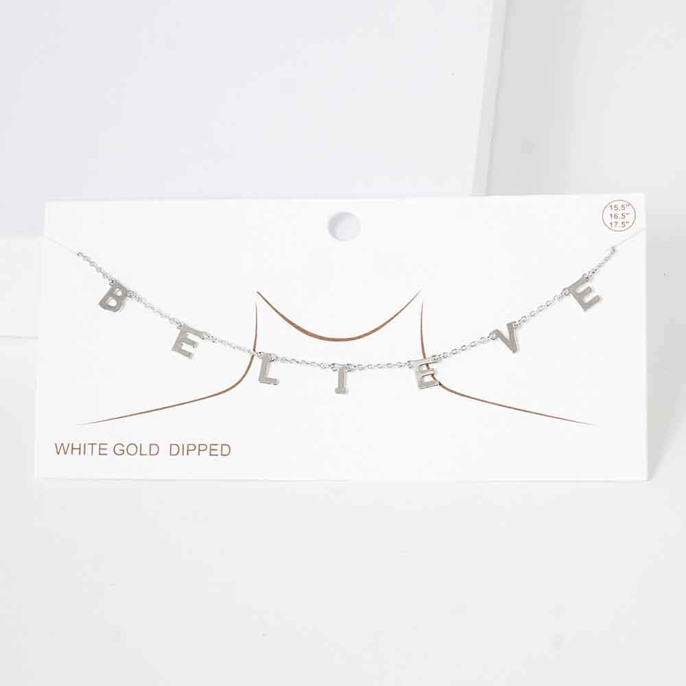 BELIEVE White Gold Dipped Metal Message Pendant Station Necklace