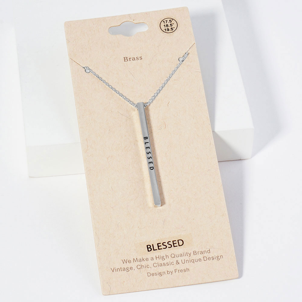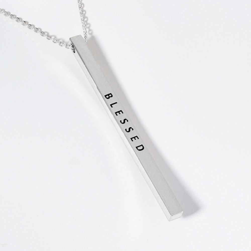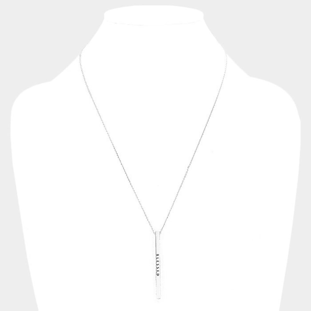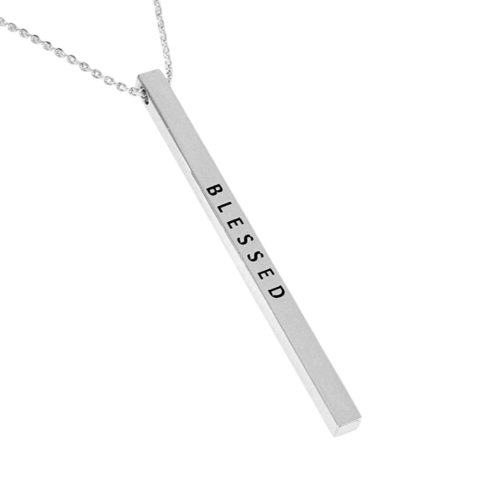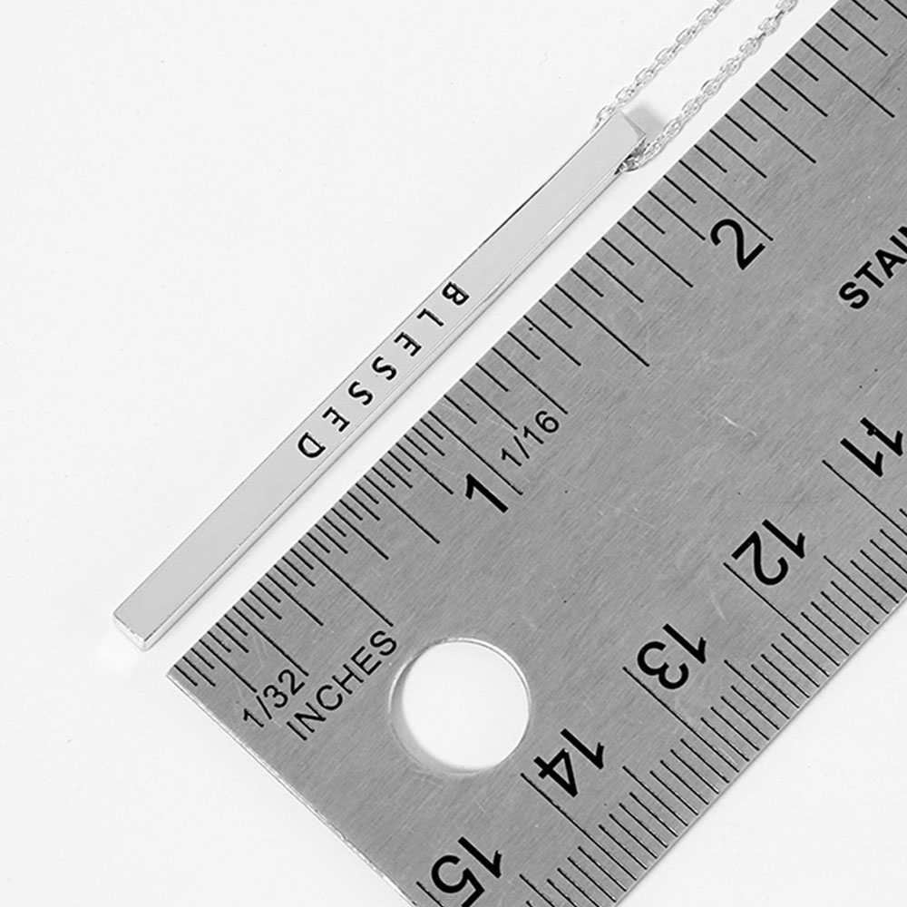 Details • Necklace Size : 19.5" + 2" L • Pendant Size : 0.2" X 2" • Embrace gratitude and style with this vertical bar necklace engraved with the word “BLESSED.” A refined accessory for daily wear or gifting, it brings a meaningful message to any outfit. Sleek and modern, perfect for stacking or wearing solo with subtle elegance. • Lead and Nickel Compliant • Brass