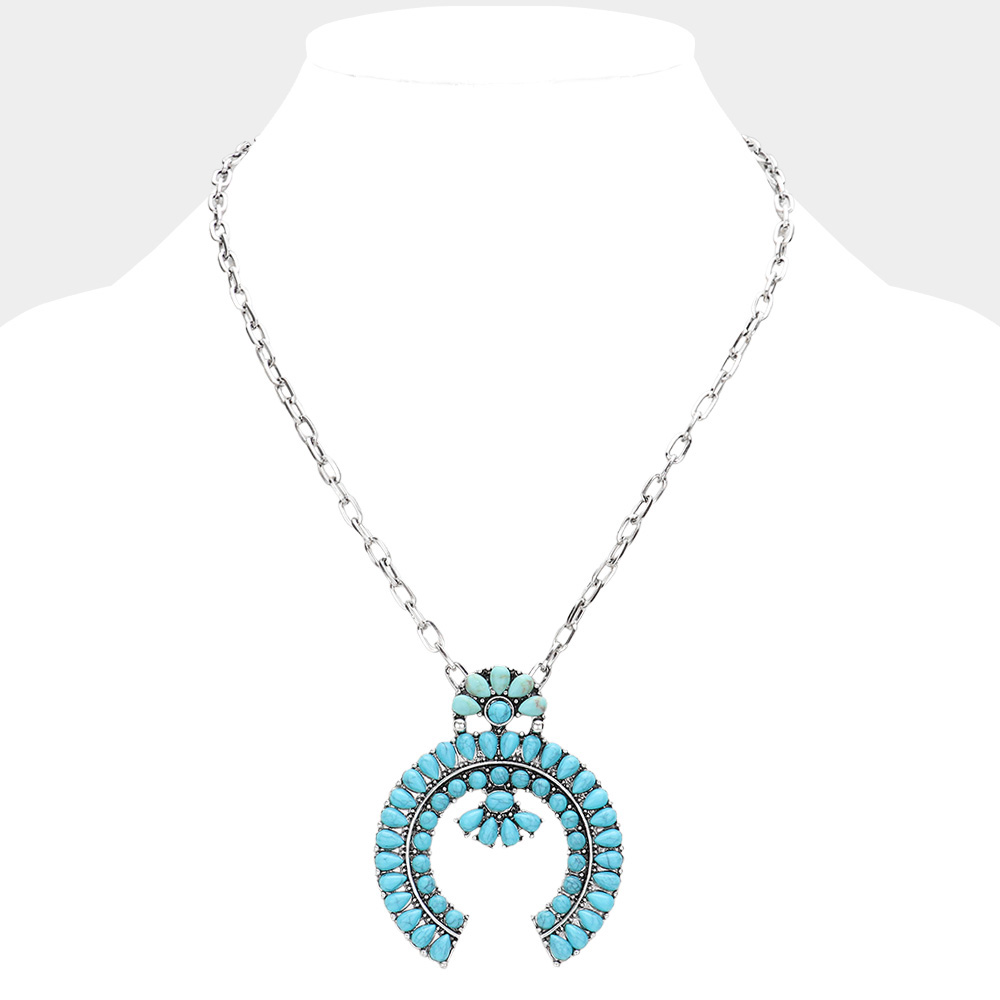 Details • Necklace Size : 20" + 2.5" L • Pendant Size : 2" X 2.5" • Statement silver-tone necklace featuring a bold crescent-shaped pendant richly adorned with layered turquoise stones in a floral and geometric arrangement. A vibrant, Southwestern-inspired piece perfect for standout boho style. • Lead and Nickel Compliant