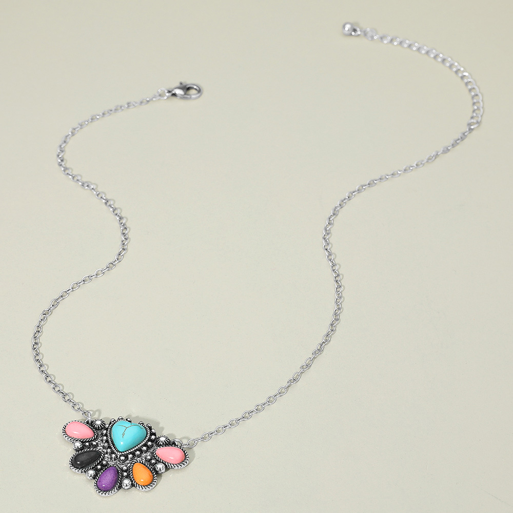 Details • Necklace Size : 18" + 3.5" L • Pendant Size : 1.75" X 1.2" • Make a bold statement with this boho-inspired multi color stone fan necklace featuring teardrop stones and intricate silver-tone detailing. Perfect for Southwestern style lovers, this eye-catching piece adds a vibrant, vintage touch to any outfit. • Lead and Nickel Compliant