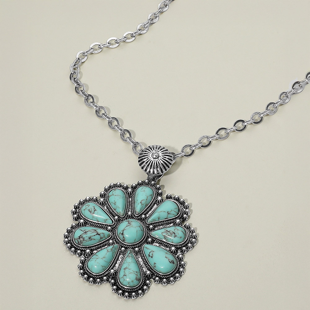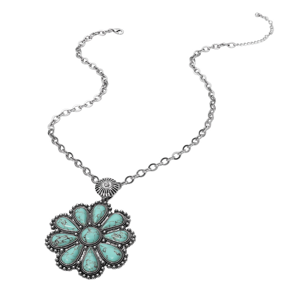 Details • Necklace Size : 24" + 3" L • Pendant Size : 2.9" X 3.8" • This Western-inspired necklace features a large floral pendant with faux stone accents and detailed metalwork. Hung on a bold chain, it's perfect for adding rustic charm to casual outfits, themed events, or country-style ensembles. A standout accessory with vintage flair. • Lead and Nickel Compliant