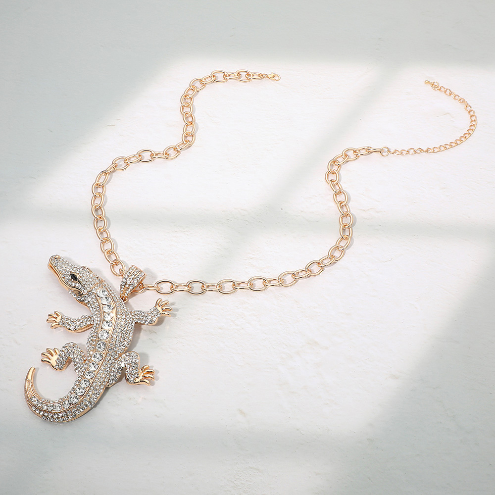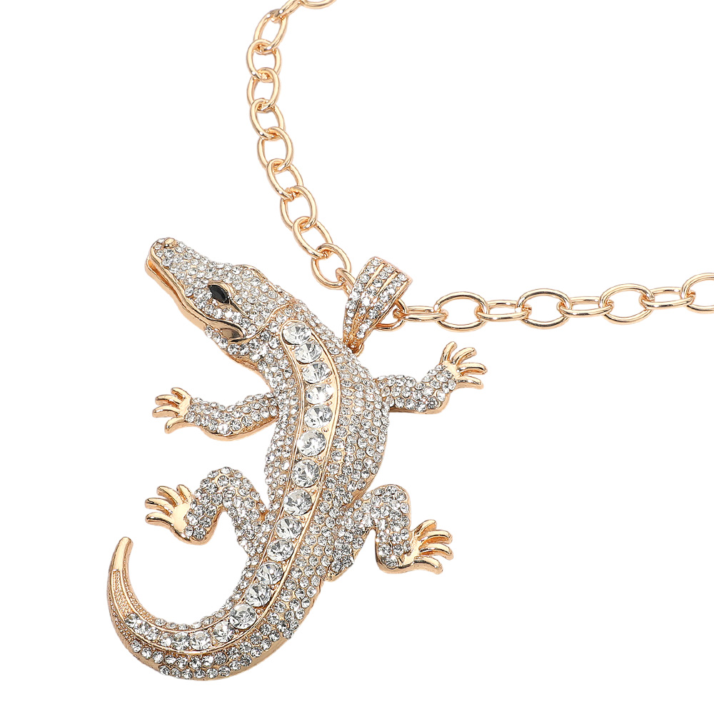 • Bold alligator pendant necklace with shimmering accents on a chunky chain. This statement jewelry piece combines edgy charm with artistic flair, perfect for fashion-forward looks or themed events, adding a fierce and captivating touch to any stylish outfit.