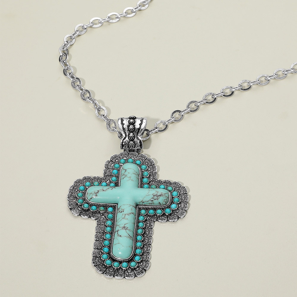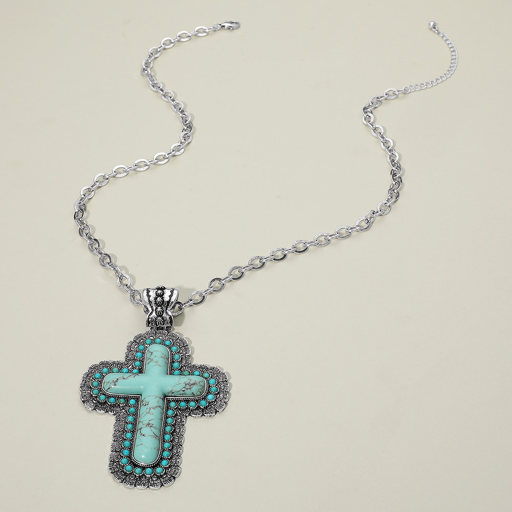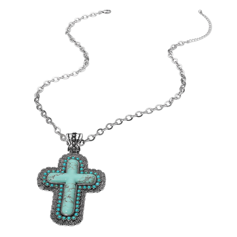 Details • Necklace Size : 24" + 3" L • Pendant Size : 1.7" X 4.2" • This Western-inspired necklace features a bold cross pendant adorned with faux turquoise accents and intricate metalwork. Perfect for adding rustic elegance and meaningful style to casual looks, festivals, or special occasions. A standout accessory or gift piece. • Lead and Nickel Compliant
