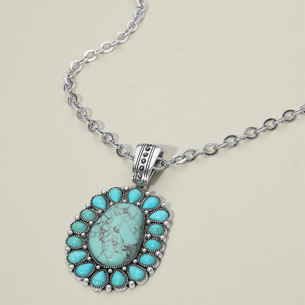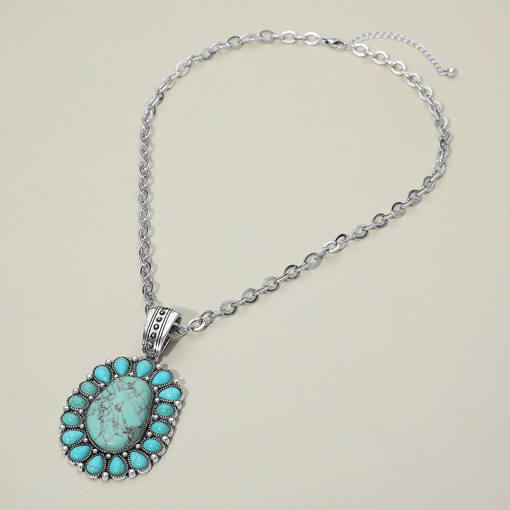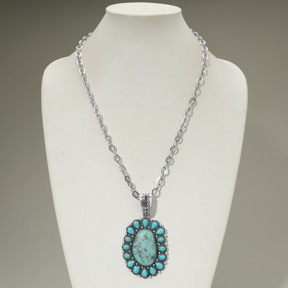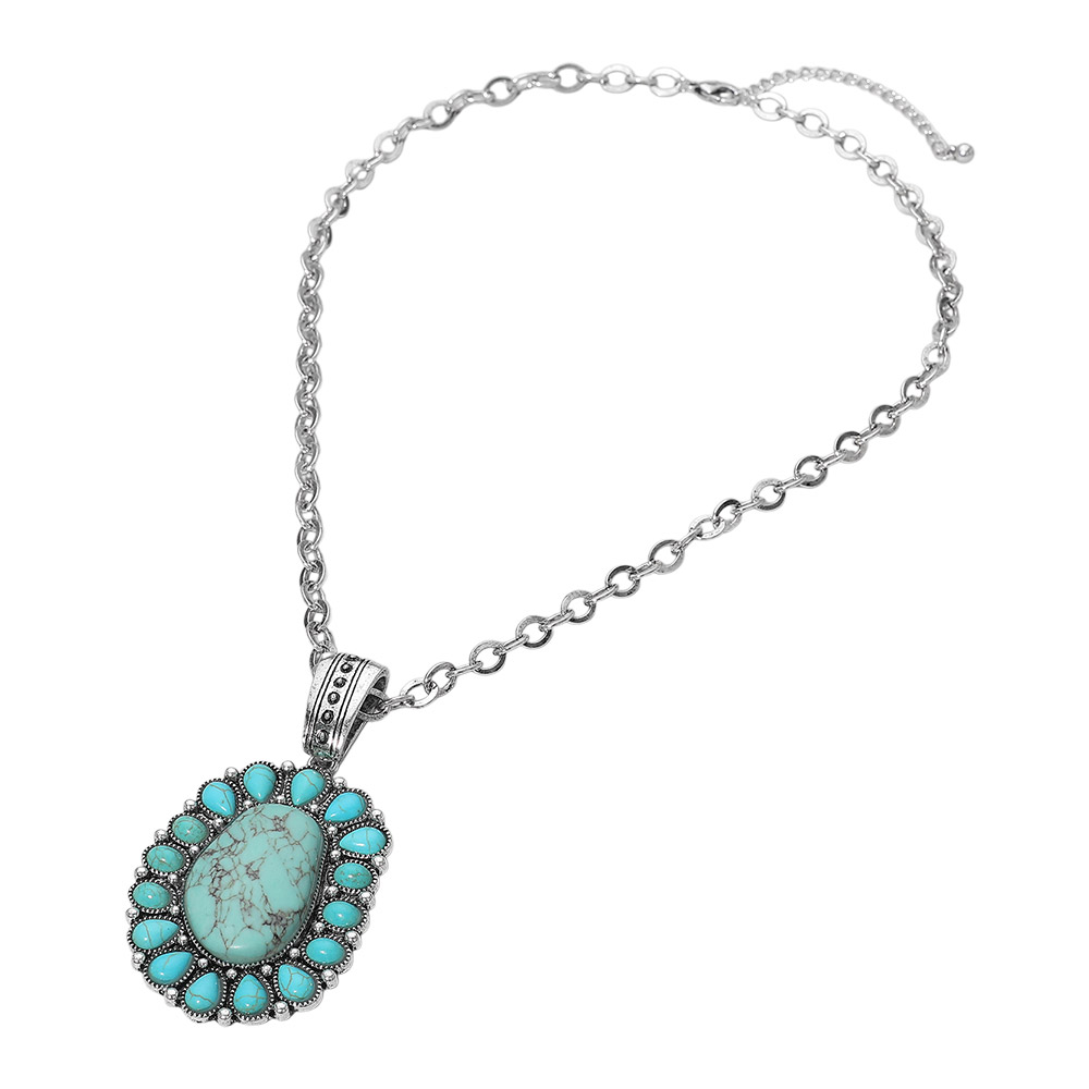 Details • Necklace Size : 24" + 3" L • Pendant Size : 2" X 3.7" • This Western-style necklace features an oval pendant with a large faux stone center surrounded by teardrop accents and intricate detailing. Set on a bold chain, it’s perfect for rustic-inspired looks, casual outfits, or adding vintage charm to special occasions. • Lead and Nickel Compliant
