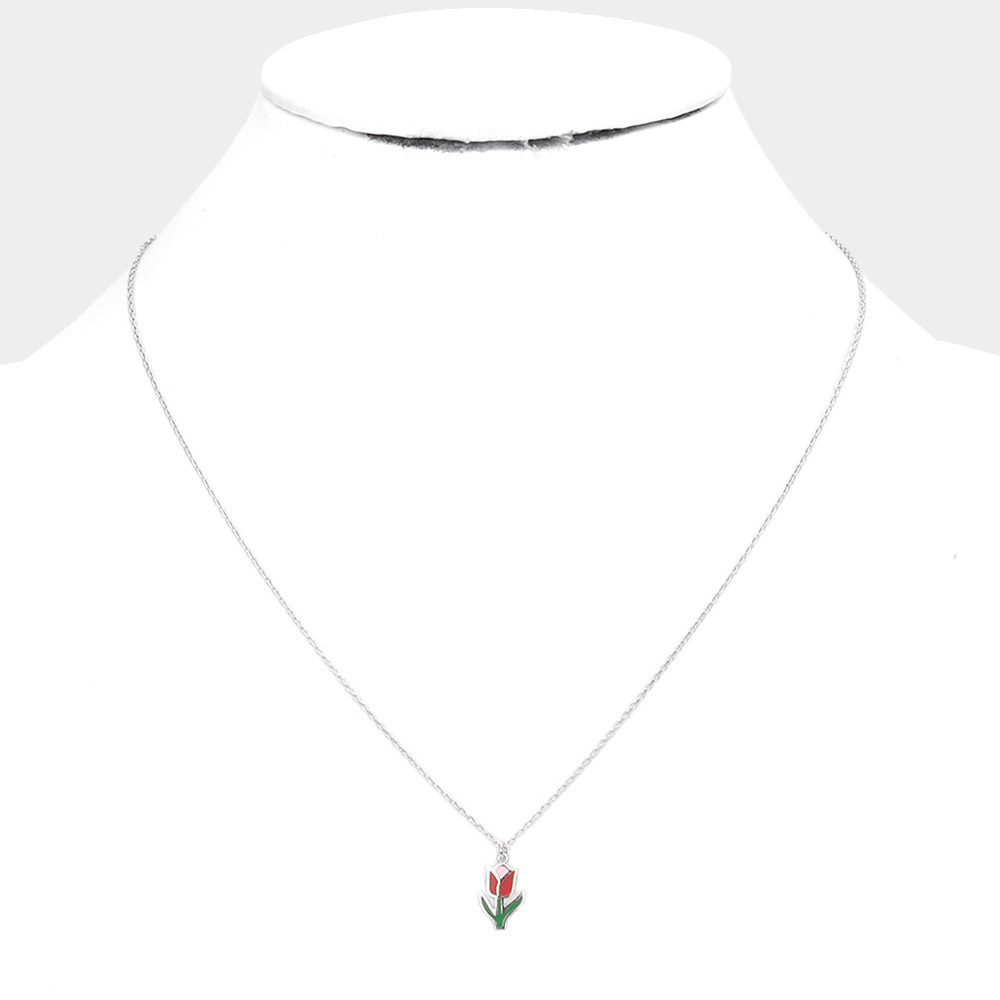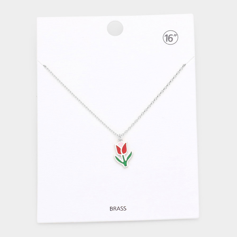 Brass Metal Enamel Tulip Flower Pendant Necklace
