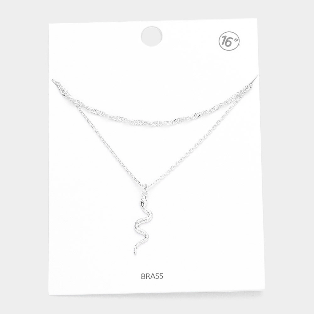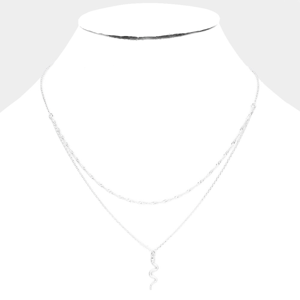 White Gold Dipped CZ Embellished Metal Snake Pendant Necklace