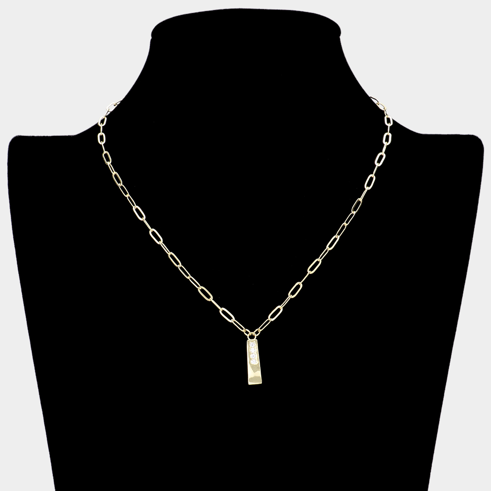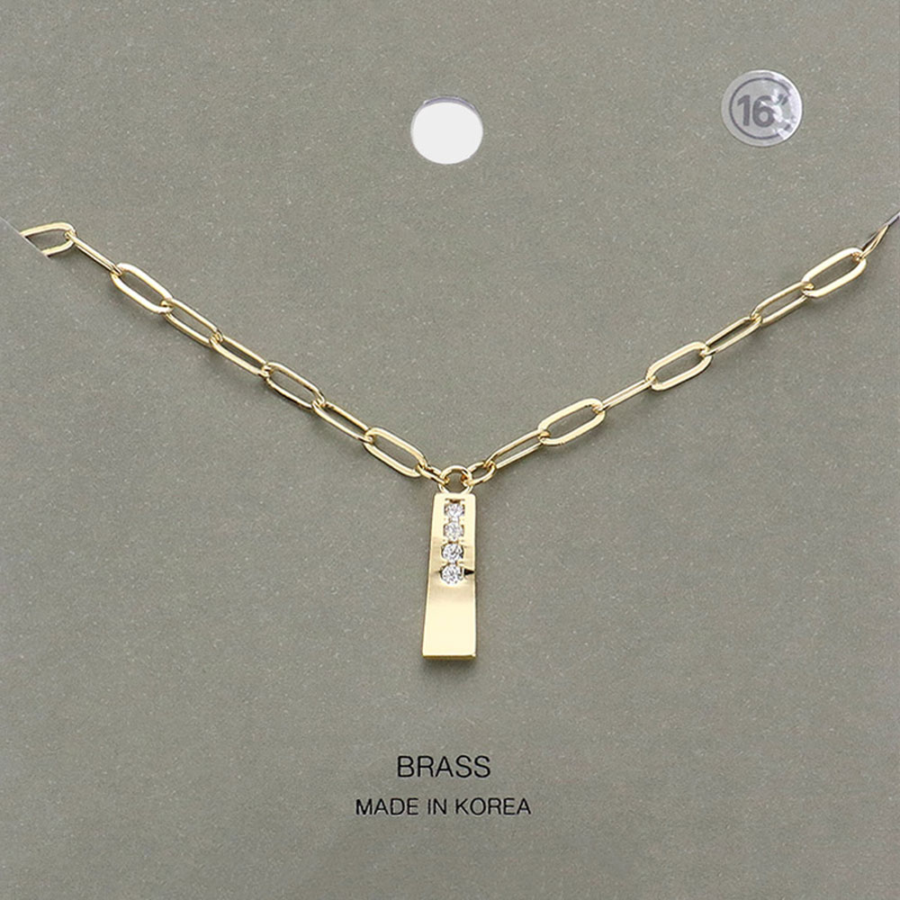 Details • Necklace Size : 16" + 3" L • Pendant Size : 0.25" X 0.75" • Sleek and elegant, this necklace features a slim rectangular pendant on a classic link chain. Subtle crystal accents add just the right touch of shine, perfect for layering or wearing solo. • Lead and Nickel Compliant • Made In Korea • Brass