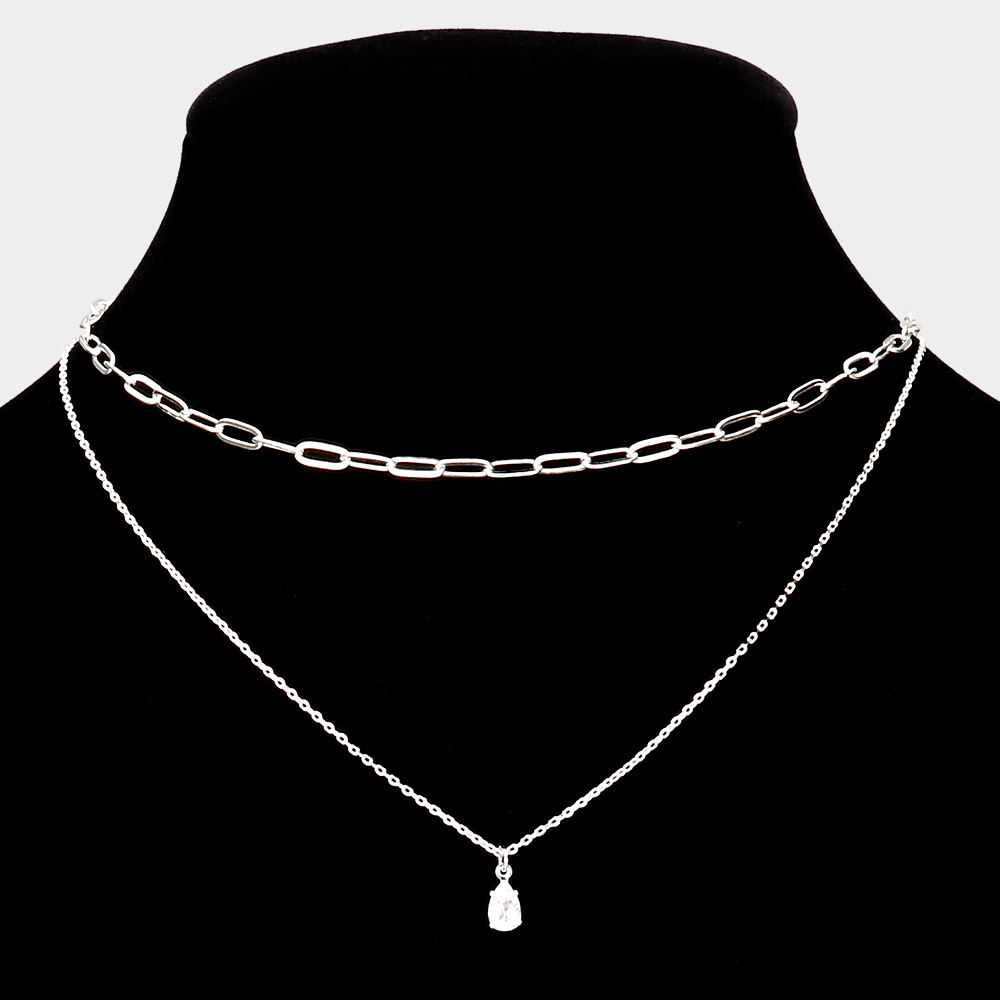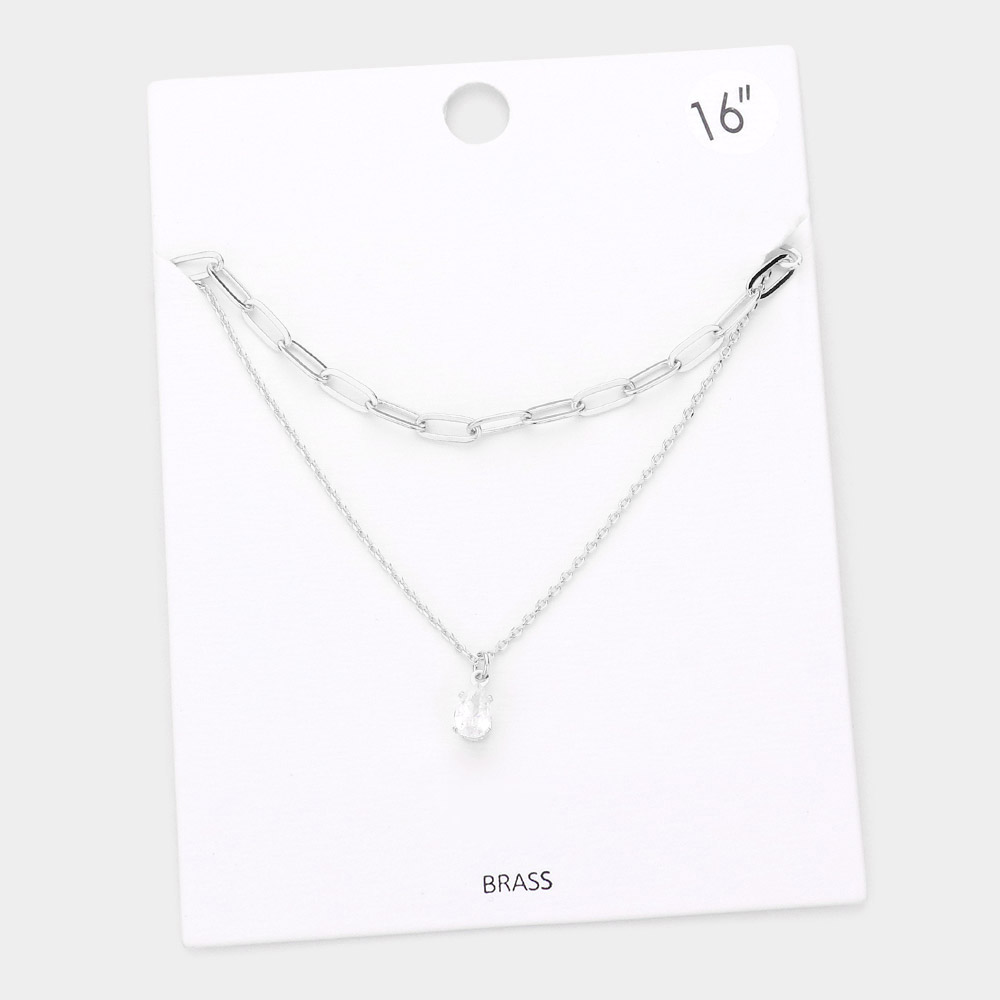 Brass Metal Teardrop Stone Pendant Double Layered Necklace
