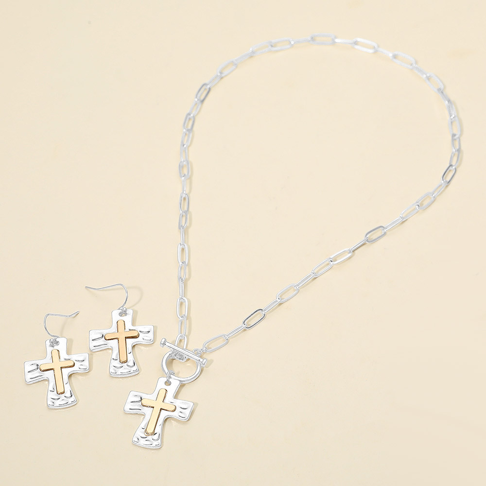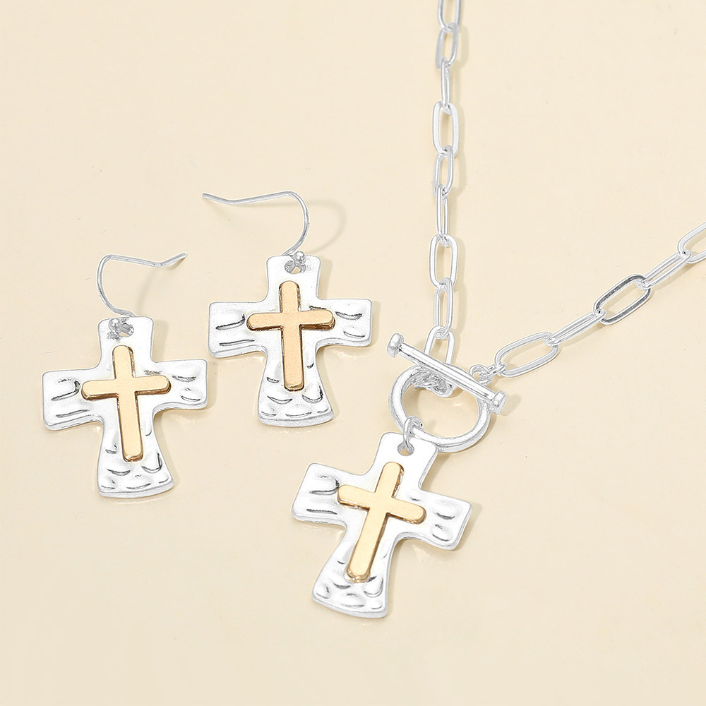 Details • Necklace Size : 18.5" L • Pendant Size : 1" X 1.2" • Earrings Size : 1.5" L • Toggle Closure • This elegant jewelry set includes a link chain necklace with a cross pendant and matching drop earrings. The hammered detailing enhances its unique charm, making it a versatile accessory for casual wear or special occasions, adding a stylish and meaningful touch to your look. • Lead and Nickel Compliant