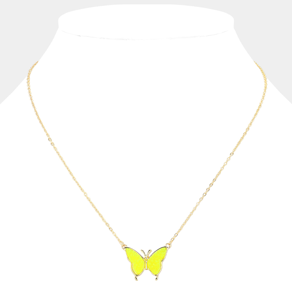 Rhinestone Embellished Brass Metal Butterfly Accented Safety Pin Pendant Necklace